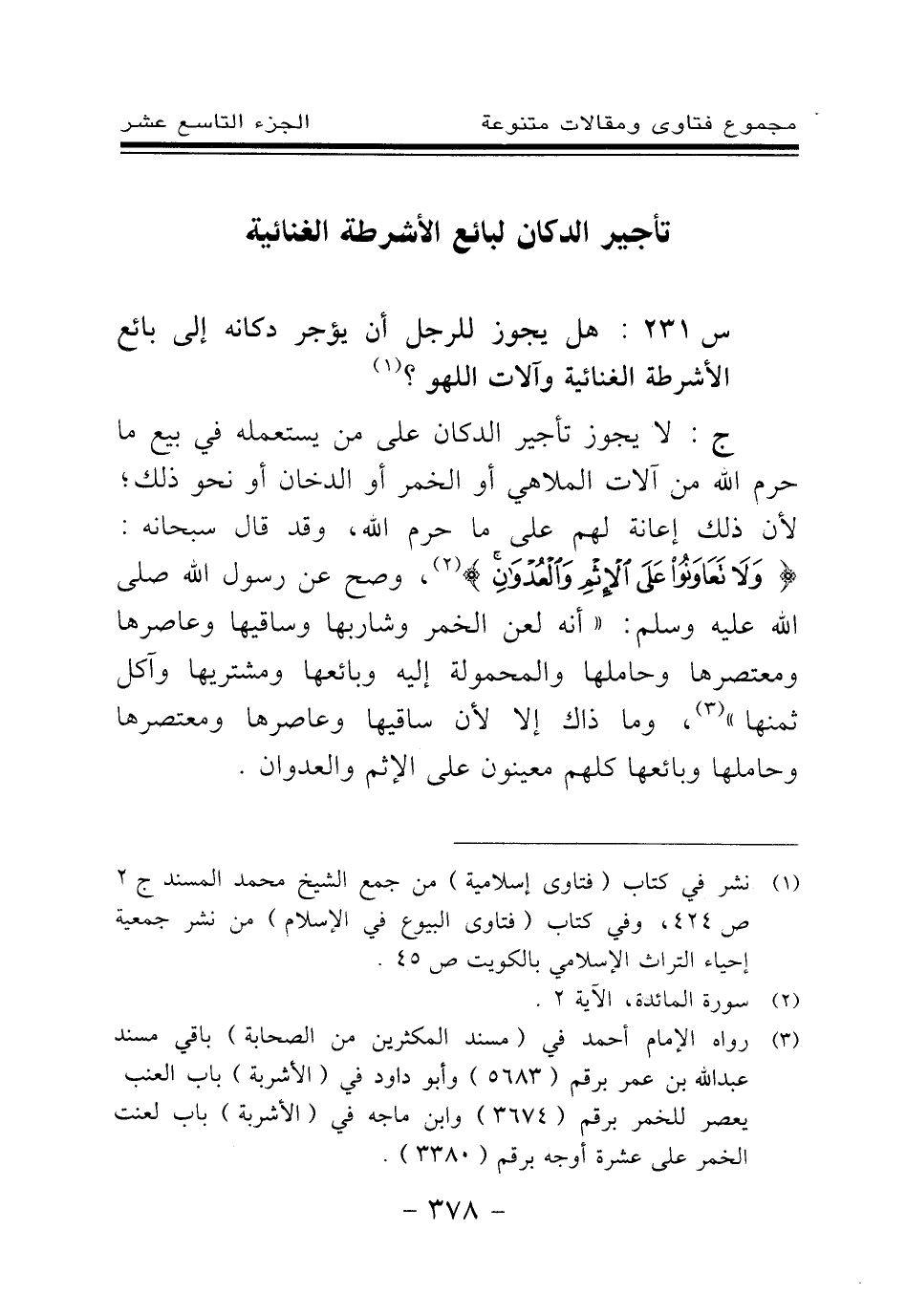 س 231: هل يجوز للرجل أن يؤجر دكانه إلى بائع الأشرطة الغنائية وآلات اللهو؟ .