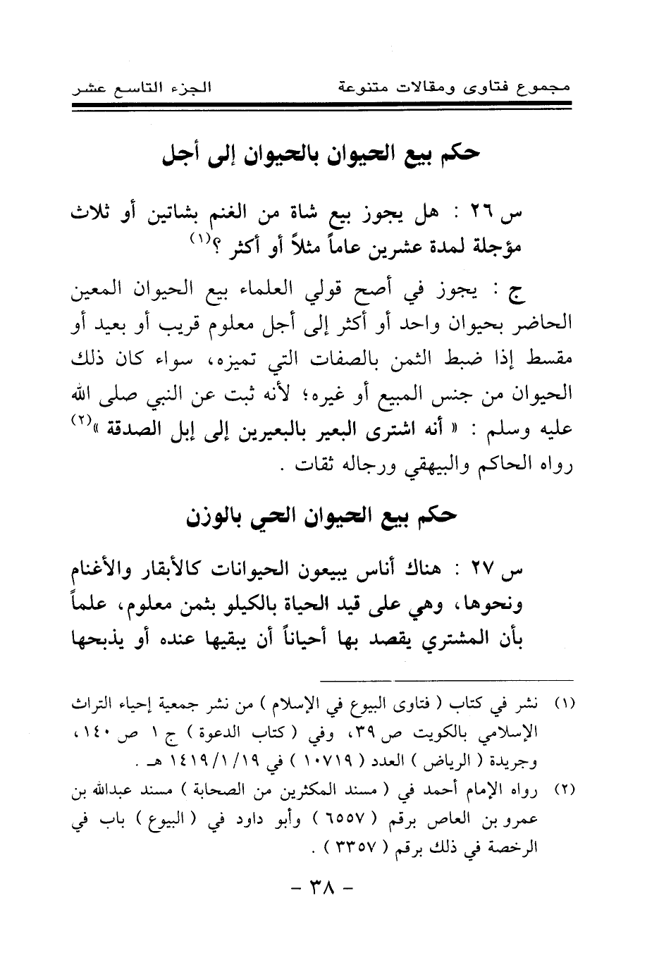 س 26: هل يجوز بيع شاة من الغنم بشاتين أو ثلاث مؤجلة لمدة عشرين عاما مثلا أو أكثر؟ .
