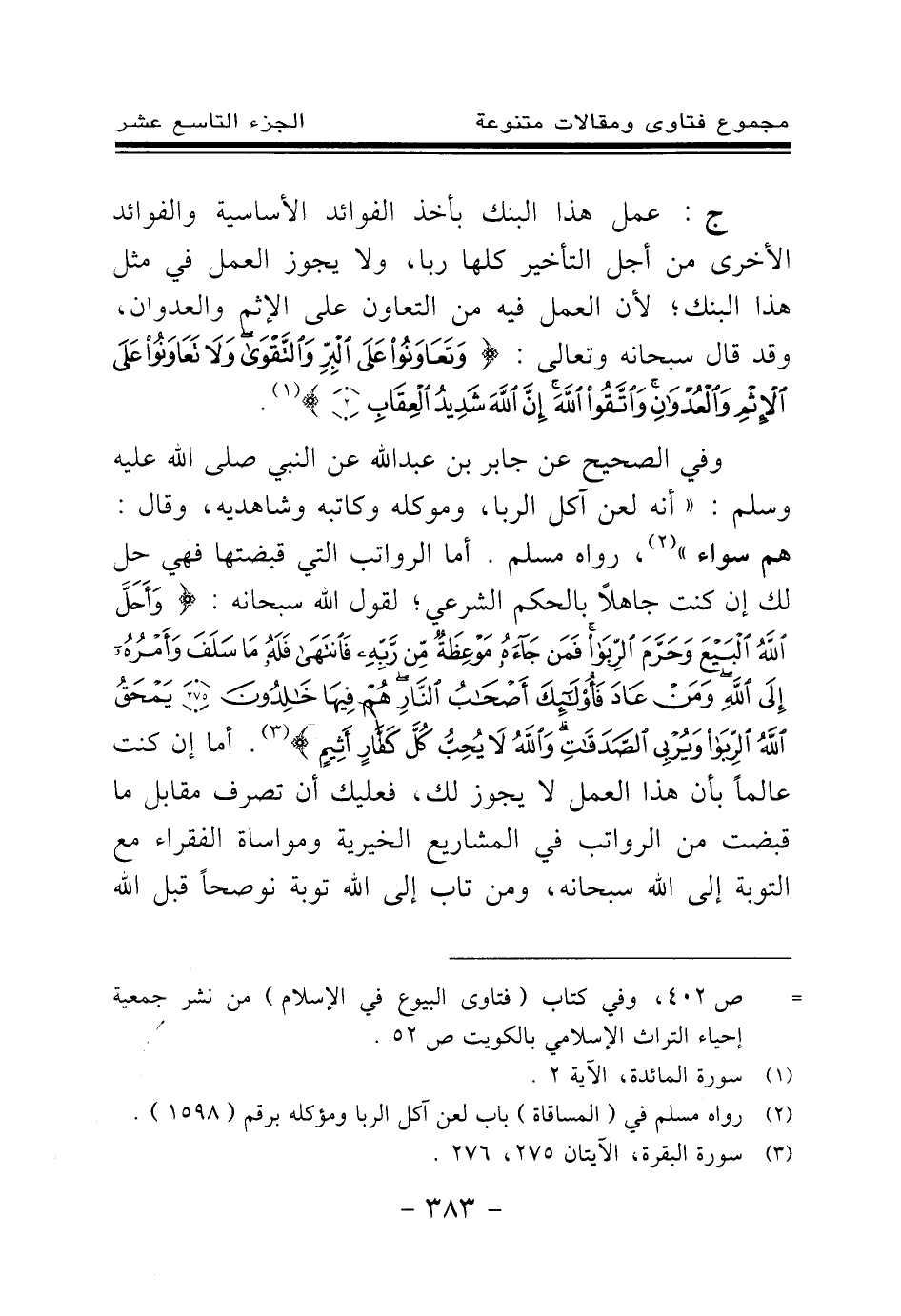 وفي الصحيح عن جابر بن عبد الله عن النبي صلى الله عليه وسلم: «أنه لعن آكل الربا، وموكله وكاتبه وشاهديه، وقال: هم سواء (¬2) » ، رواه مسلم. أما الرواتب التي قبضتها فهي حل لك إن كنت جاهلا بالحكم الشرعي؛ لقول الله سبحانه: {وَأَحَلَّ اللَّهُ الْبَيْعَ وَحَرَّمَ الرِّبَا فَمَنْ جَاءَهُ مَوْعِظَةٌ مِنْ رَبِّهِ فَانْتَهَى فَلَهُ مَا سَلَفَ وَأَمْرُهُ إِلَى اللَّهِ وَمَنْ عَادَ فَأُولَئِكَ أَصْحَابُ النَّارِ هُمْ فِيهَا خَالِدُونَ} (¬3) {يَمْحَقُ اللَّهُ الرِّبَا وَيُرْبِي الصَّدَقَاتِ وَاللَّهُ لَا يُحِبُّ كُلَّ كَفَّارٍ أَثِيمٍ} (¬4) أما إن كنت عالما بأن هذا العمل لا يجوز لك، فعليك أن تصرف مقابل ما قبضت من الرواتب في المشاريع الخيرية ومواساة الفقراء مع التوبة إلى الله سبحانه، ومن تاب إلى الله توبة نصوحا قبل الله
