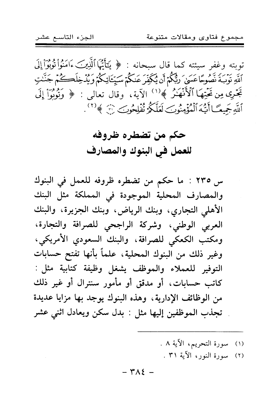 س 235: ما حكم من تضطره ظروفه للعمل في البنوك والمصارف المحلية الموجودة في المملكة مثل البنك الأهلي التجاري، وبنك الرياض، وبنك الجزيرة، والبنك العربي الوطني، وشركة الراجحي للصرافة والتجارة، ومكتب الكعكي للصرافة، والبنك السعودي الأمريكي، وغير ذلك من البنوك المحلية، علما بأنها تفتح حسابات التوفير للعملاء والموظف يشغل وظيفة كتابية مثل: كاتب حسابات، أو مدقق أو مأمور سنترال أو غير ذلك من الوظائف الإدارية، وهذه البنوك يوجد بها مزايا عديدة تجذب الموظفين إليها مثل: بدل سكن ويعادل اثني عشر