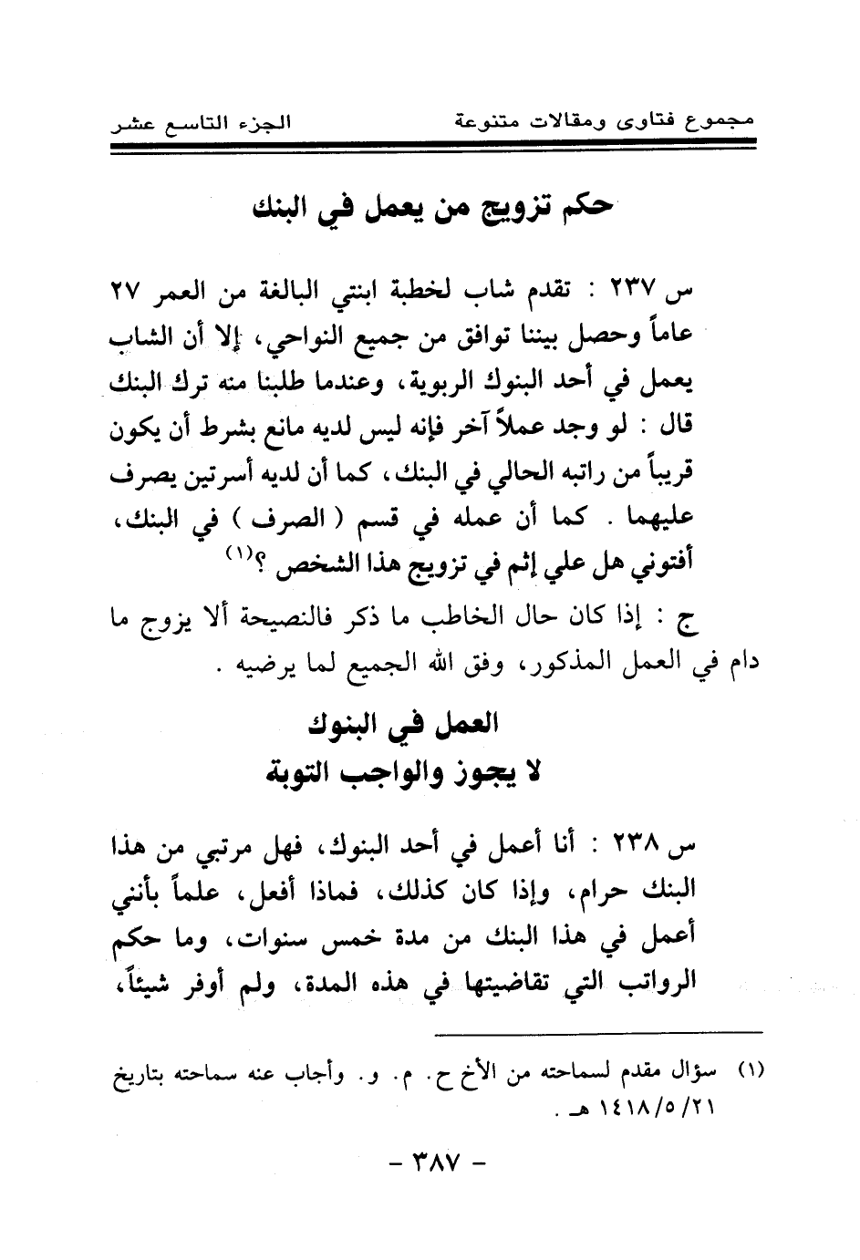س 237: تقدم شاب لخطبة ابنتي البالغة من العمر 27 عاما وحصل بيننا توافق من جميع النواحي، إلا أن الشاب يعمل في أحد البنوك الربوية، وعندما طلبنا منه ترك البنك قال: لو وجد عملا آخر فإنه ليس لديه مانع بشرط أن يكون قريبا من راتبه الحالي في البنك، كما أن لديه أسرتين يصرف عليهما. كما أن عمله في قسم (الصرف) في البنك، أفتوني هل علي إثم في تزويج هذا الشخص؟ (¬1) .