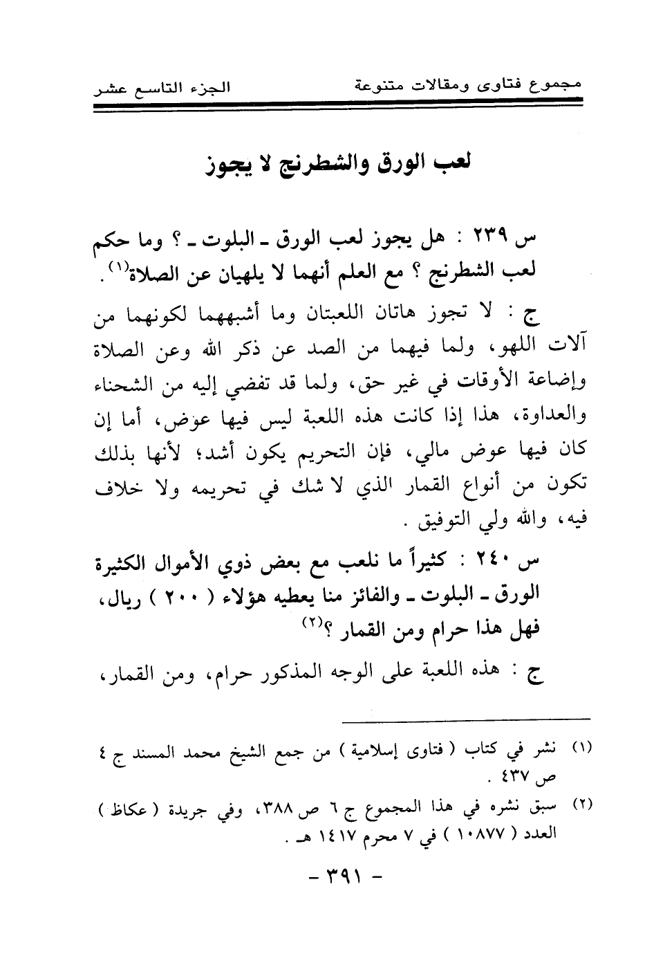 س 239: هل يجوز لعب الورق- البلوت -؟ وما حكم لعب الشطرنج؟ مع العلم أنهما لا يلهيان عن الصلاة (¬1) .