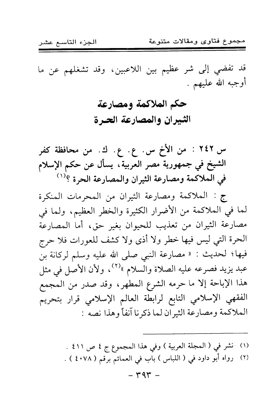 س 242: من الأخ س. ع. ع. ك. من محافظة كفر الشيخ في جمهورية مصر العربية، يسأل عن حكم الإسلام في الملاكمة ومصارعة الثيران والمصارعة الحرة؟ (¬1) .