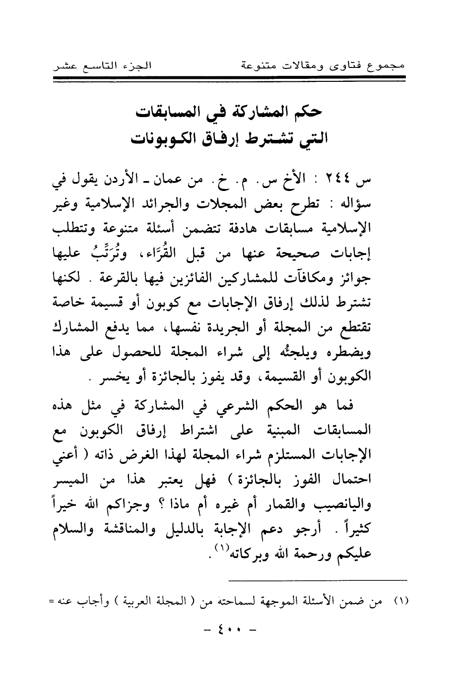 س 244: الأخ س. م. خ. من عمان - الأردن يقول في سؤاله: تطرح بعض المجلات والجرائد الإسلامية وغير الإسلامية مسابقات هادفة تتضمن أسئلة متنوعة وتتطلب إجابات صحيحة عنها من قبل القراء، وترتب عليها جوائز ومكافآت للمشاركين الفائزين فيها بالقرعة. لكنها تشترط لذلك إرفاق الإجابات مع كوبون أو قسيمة خاصة تقتطع من المجلة أو الجريدة نفسها، مما يدفع المشارك ويضطره ويلجئه إلى شراء المجلة للحصول على هذا الكوبون أو القسيمة، وقد يفوز بالجائزة أو يخسر.