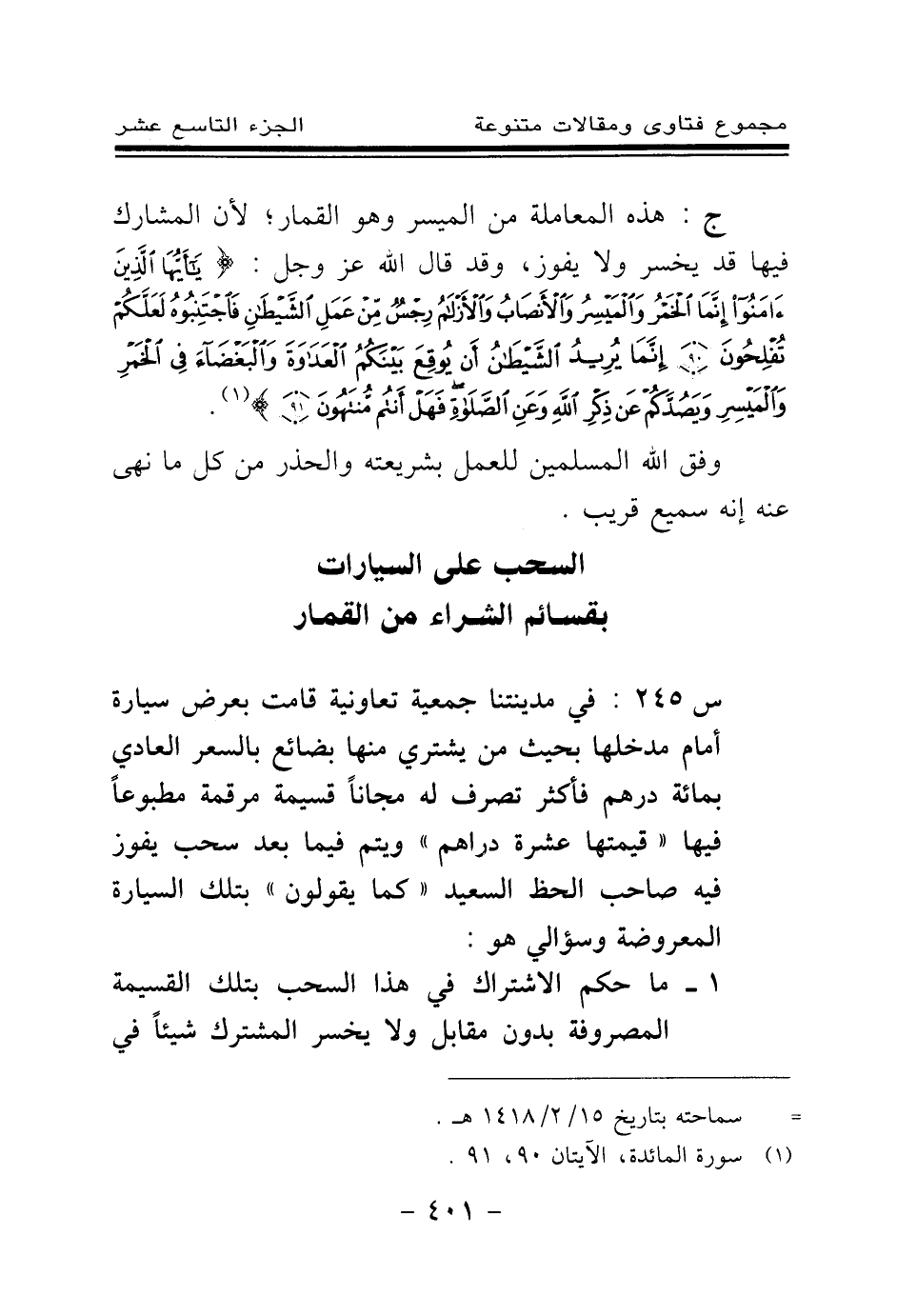 ج: هذه المعاملة من الميسر وهو القمار؛ لأن المشارك فيها قد يخسر ولا يفوز، وقد قال الله عز وجل: {يَا أَيُّهَا الَّذِينَ آمَنُوا إِنَّمَا الْخَمْرُ وَالْمَيْسِرُ وَالْأَنْصَابُ وَالْأَزْلَامُ رِجْسٌ مِنْ عَمَلِ الشَّيْطَانِ فَاجْتَنِبُوهُ لَعَلَّكُمْ تُفْلِحُونَ} (¬1) {إِنَّمَا يُرِيدُ الشَّيْطَانُ أَنْ يُوقِعَ بَيْنَكُمُ الْعَدَاوَةَ وَالْبَغْضَاءَ فِي الْخَمْرِ وَالْمَيْسِرِ وَيَصُدَّكُمْ عَنْ ذِكْرِ اللَّهِ وَعَنِ الصَّلَاةِ فَهَلْ أَنْتُمْ مُنْتَهُونَ} (¬2)