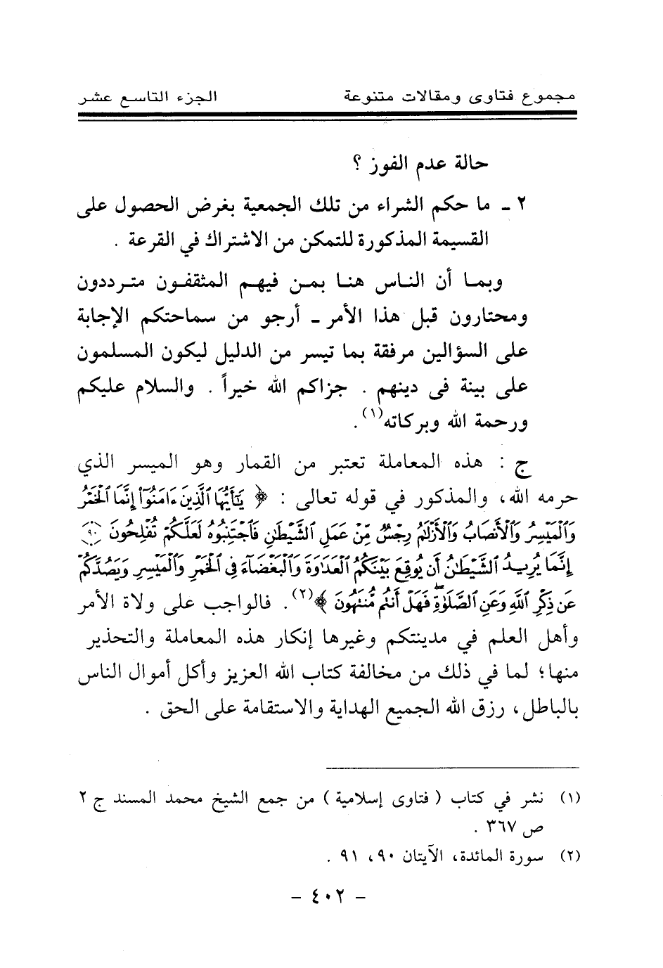 ج: هذه المعاملة تعتبر من القمار وهو الميسر الذي حرمه الله، والمذكور في قوله تعالى: {يَا أَيُّهَا الَّذِينَ آمَنُوا إِنَّمَا الْخَمْرُ وَالْمَيْسِرُ وَالْأَنْصَابُ وَالْأَزْلَامُ رِجْسٌ مِنْ عَمَلِ الشَّيْطَانِ فَاجْتَنِبُوهُ لَعَلَّكُمْ تُفْلِحُونَ} (¬2) {إِنَّمَا يُرِيدُ الشَّيْطَانُ أَنْ يُوقِعَ بَيْنَكُمُ الْعَدَاوَةَ وَالْبَغْضَاءَ فِي الْخَمْرِ وَالْمَيْسِرِ وَيَصُدَّكُمْ عَنْ ذِكْرِ اللَّهِ وَعَنِ الصَّلَاةِ فَهَلْ أَنْتُمْ مُنْتَهُونَ} (¬3) فالواجب على ولاة الأمر وأهل العلم في مدينتكم وغيرها إنكار هذه المعاملة والتحذير منها؛ لما في ذلك من مخالفة كتاب الله العزيز وأكل أموال الناس بالباطل، رزق الله الجميع الهداية والاستقامة على الحق.