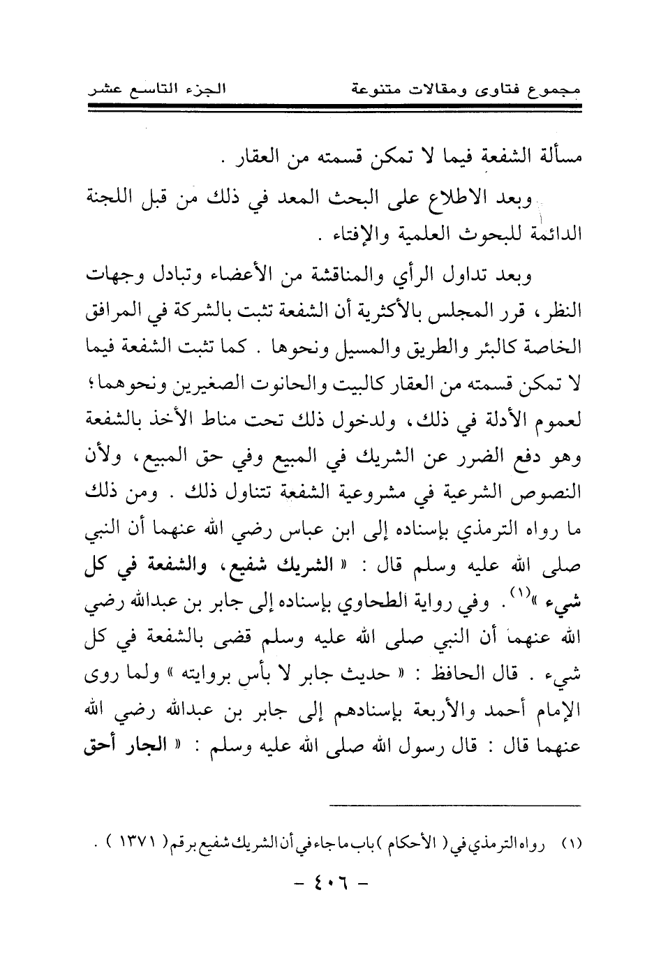 وبعد تداول الرأي والمناقشة من الأعضاء وتبادل وجهات النظر، قرر المجلس بالأكثرية أن الشفعة تثبت بالشركة في المرافق الخاصة كالبئر والطريق والمسيل ونحوها. كما تثبت الشفعة فيما لا تمكن قسمته من العقار كالبيت والحانوت الصغيرين ونحوهما؛ لعموم الأدلة في ذلك، ولدخول ذلك تحت مناط الأخذ بالشفعة وهو دفع الضرر عن الشريك في المبيع وفي حق المبيع، ومن ذلك ما رواه الترمذي بإسناد إلى ابن عباس رضي الله عنهما أن النبي صلى الله عليه وسلم قال: «الشريك شفيع، والشفعة في كل شيء (¬1) » . وفي رواية الطحاوي بإسناده إلى جابر بن عبد الله رضي الله عنهما أن النبي صلى الله عليه وسلم قضى بالشفعة في كل شيء. قال الحافظ: " حديث جابر لا بأس بروايته" ولما روى الإمام أحمد والأربعة بإسنادهم إلى جابر بن عبد الله رضي الله عنهما قال: قال رسول الله صلى الله عليه وسلم: «الجار أحق