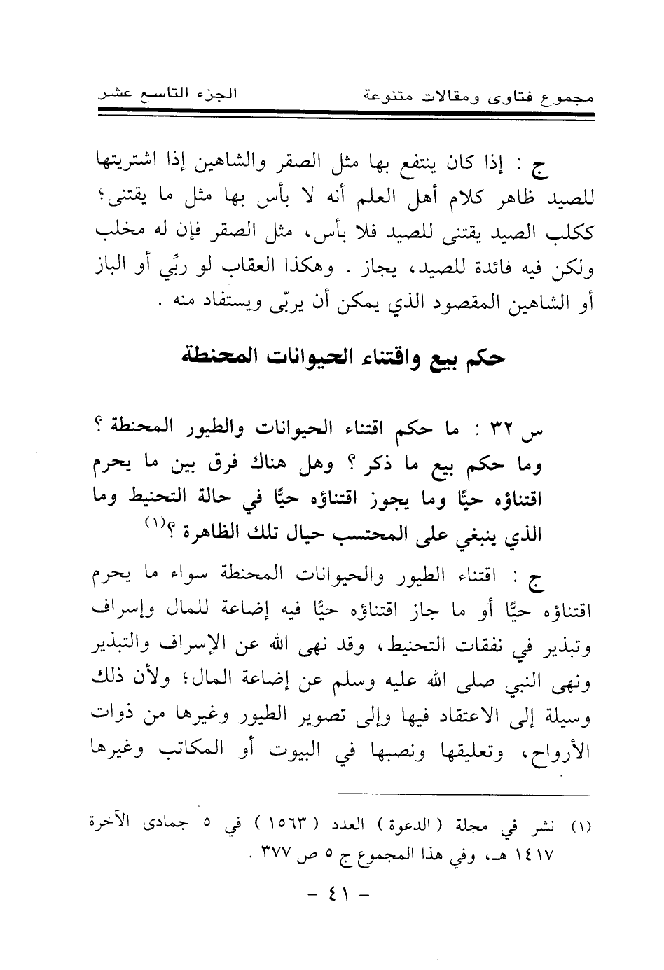 س 32: ما حكم اقتناء الحيوانات والطيور المحنطة؟
