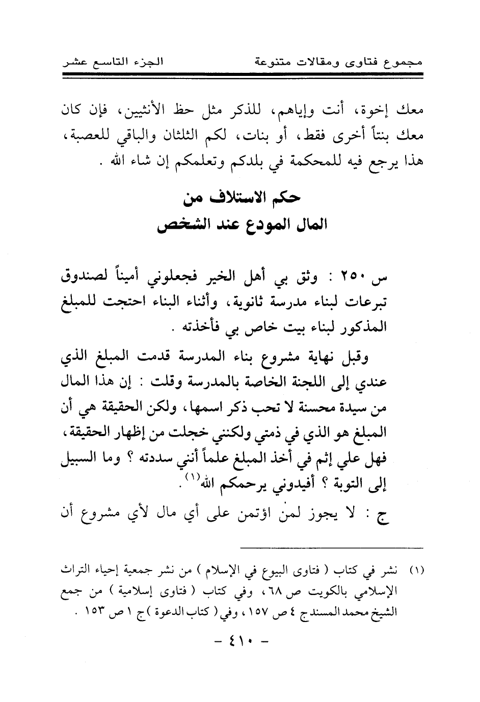 س 250: وثق بي أهل الخير فجعلوني أمينا لصندوق تبرعات لبناء مدرسة ثانوية، وأثناء البناء احتجت للمبلغ المذكور لبناء بيت خاص بي فأخذته.