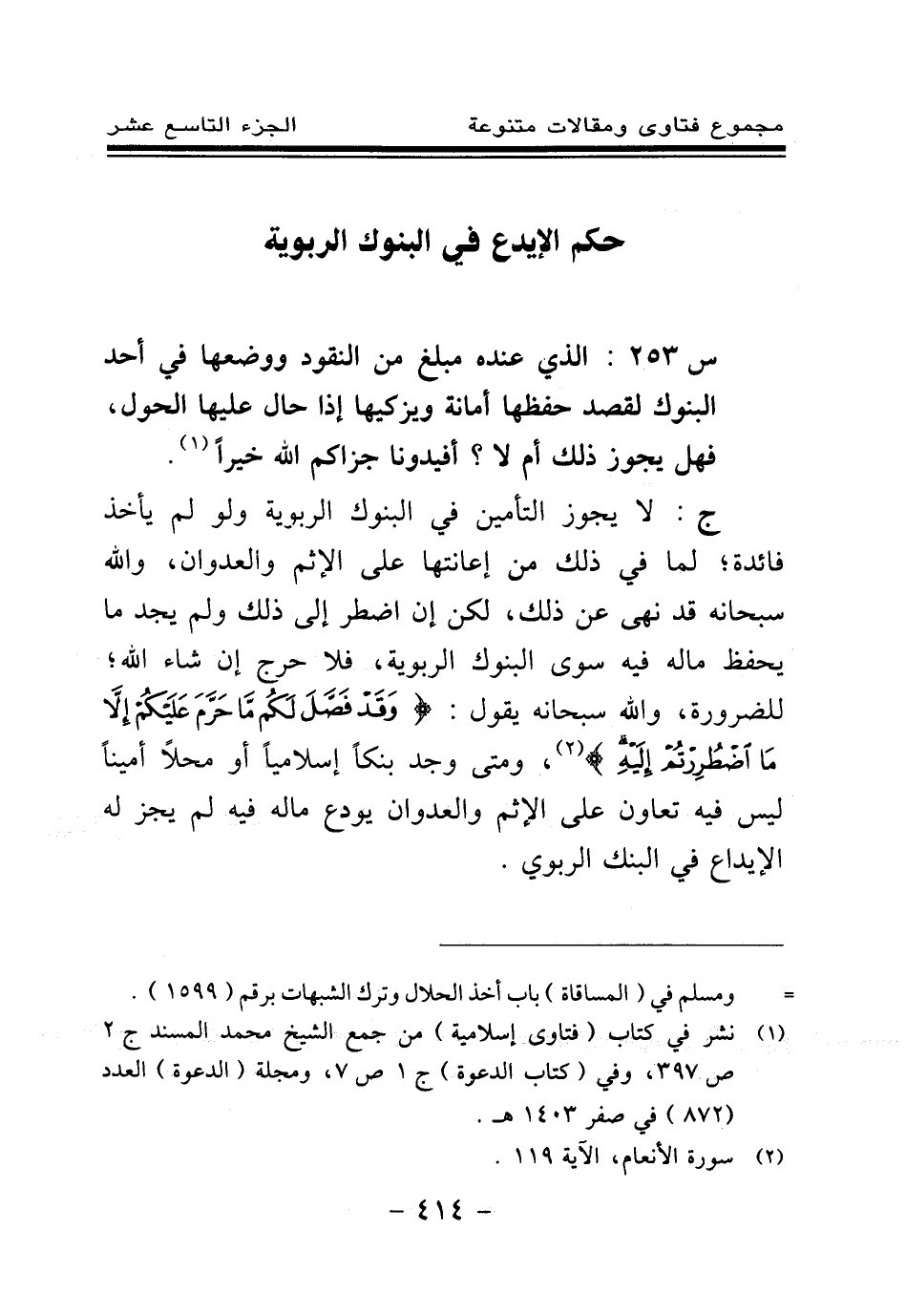 س 253: الذي عنده مبلغ من النقود ووضعها في أحد البنوك لقصد حفظها أمانة ويزكيها إذا حال عليها الحول، فهل يجوز ذلك أم لا؟ أفيدونا جزاكم الله خيرا.