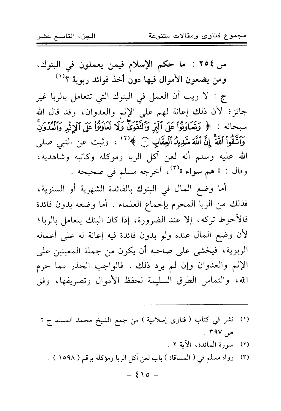 س 254: ما حكم الإسلام فيمن يعملون في البنوك، ومن يضعون الأموال فيها دون أخذ فوائد ربوية؟ (¬1) .