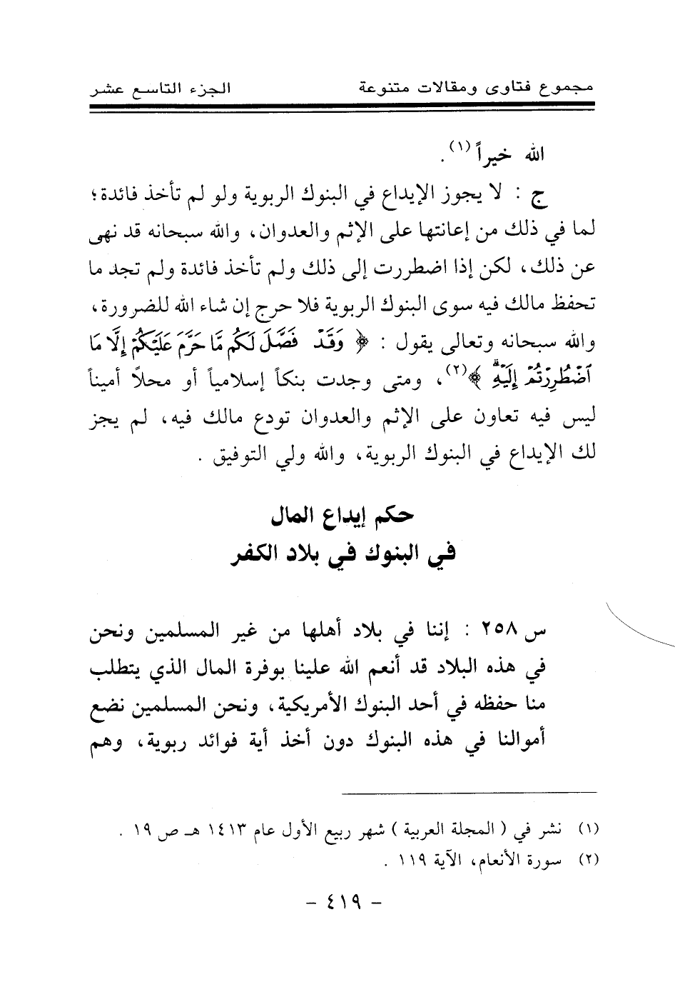 س 258: إننا في بلاد أهلها من غير المسلمين ونحن في هذه البلاد قد أنعم الله علينا بوفرة المال الذي يتطلب منا حفظه في أحد البنوك الأمريكية، ونحن المسلمين نضع أموالنا في هذه البنوك دون أخذ أية فوائد ربوية، وهم