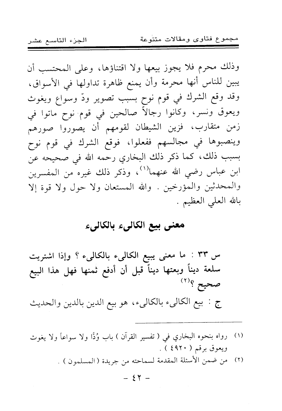 وذلك محرم فلا يجوز بيعها ولا اقتناؤها، وعلى المحتسب أن يبين للناس أنها محرمة وأن يمنع ظاهرة تداولها في الأسواق، وقد وقع الشرك في قوم نوح بسبب تصوير ود وسواع ويغوث ويعوق ونسر، وكانوا رجالا صالحين في قوم نوح ماتوا في زمن متقارب، فزين الشيطان لقومهم أن يصوروا صورهم وينصبوها في مجالسهم ففعلوا، فوقع الشرك في قوم نوح بسبب ذلك، كما ذكر ذلك البخاري رحمه الله في صحيحه عن ابن عباس رضي الله عنهما (¬1) ، وذكر ذلك غيره من المفسرين والمحدثين والمؤرخين. والله المستعان ولا حول ولا قوة إلا بالله العلي العظيم.