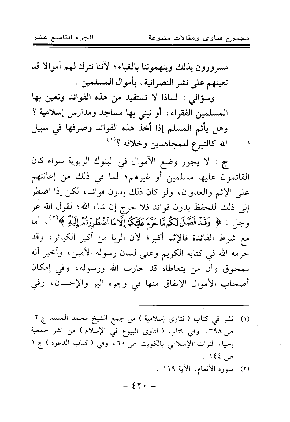 ج: لا يجوز وضع الأموال في البنوك الربوية سواء كان القائمون عليها مسلمين أو غيرهم؛ لما في ذلك من إعانتهم على الإثم والعدوان، ولو كان ذلك بدون فوائد، لكن إذا اضطر إلى ذلك للحفظ بدون فوائد فلا حرج إن شاء الله؛ لقول الله عز وجل: {وَقَدْ فَصَّلَ لَكُمْ مَا حَرَّمَ عَلَيْكُمْ إِلَّا مَا اضْطُرِرْتُمْ إِلَيْهِ} (¬1) أما مع شرط الفائدة فالإثم أكبر؛ لأن الربا من أكبر الكبائر، وقد حرمه الله في كتابه الكريم وعلى لسان رسوله الأمين، وأخبر أنه ممحوق وأن من يتعاطاه قد حارب الله ورسوله، وفي إمكان أصحاب الأموال الإنفاق منها في وجوه البر والإحسان، وفي