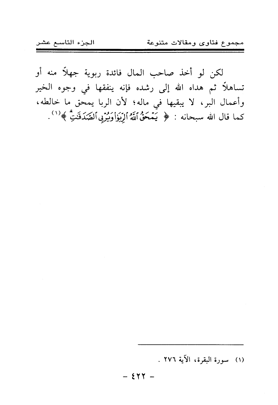 لكن لو أخذ صاحب المال فائدة ربوية جهلا منه أو تساهلا ثم هداه الله إلى رشده فإنه ينفقها في وجوه الخير وأعمال البر، لا يبقيها في ماله؛ لأن الربا يمحق ما خالطه، كما قال الله سبحانه: {يَمْحَقُ اللَّهُ الرِّبَا وَيُرْبِي الصَّدَقَاتِ} (¬1)