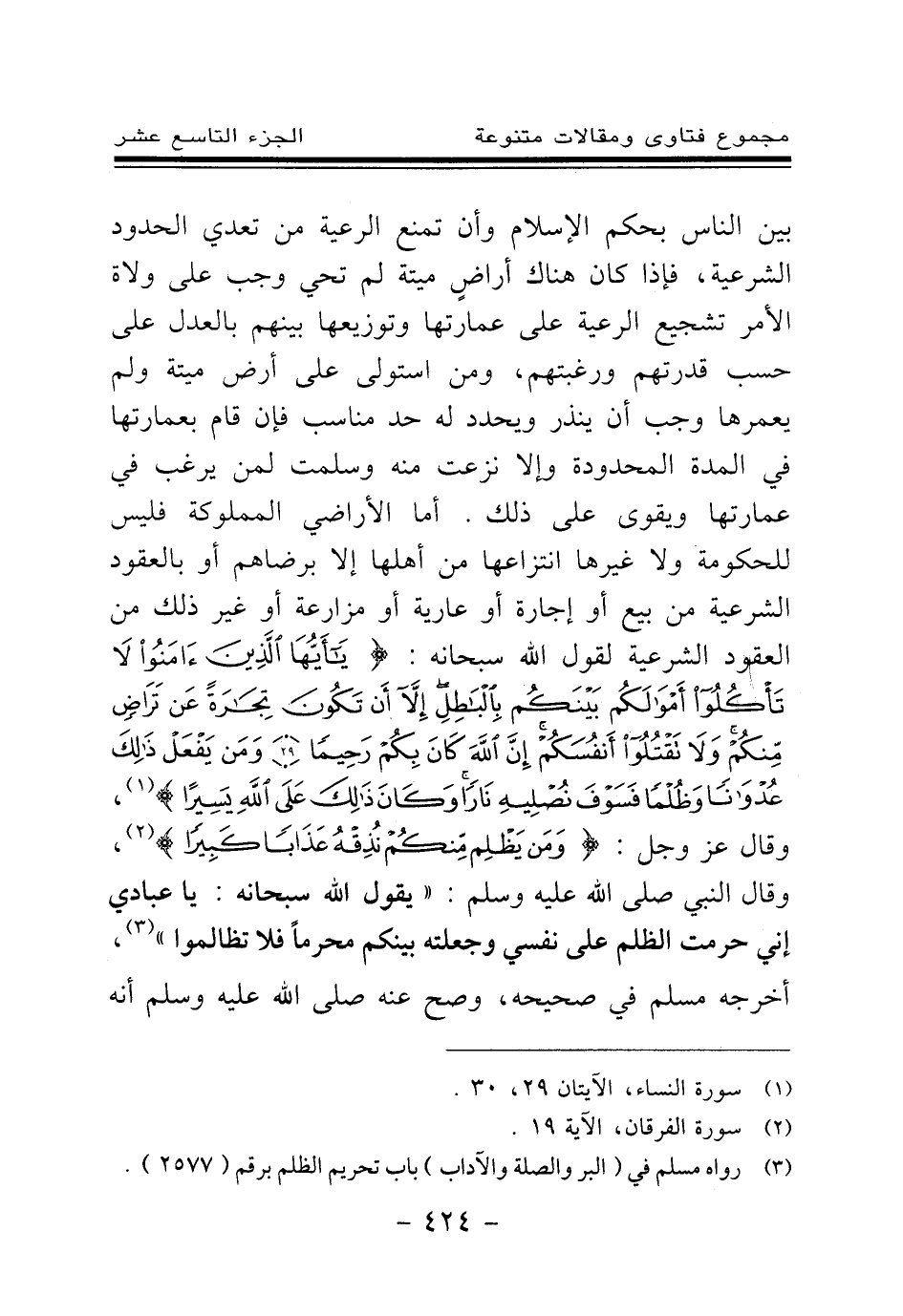 بين الناس بحكم الإسلام وأن تمنع الرعية من تعدي الحدود الشرعية، فإذا كان هناك أراض ميتة لم تحي وجب على ولاة الأمر تشجيع الرعية على عمارتها وتوزيعها بينهم بالعدل على حسب قدرتهم ورغبتهم، ومن استولى على أرض ميتة ولم يعمرها وجب أن ينذر ويحدد له حدا مناسبا فإن قام بعمارتها في المدة المحدودة وإلا نزعت منه وسلمت لمن يرغب في عمارتها ويقوى على ذلك. أما الأراضي المملوكة فليس للحكومة ولا غيرها انتزاعها من أهلها إلا برضاهم أو بالعقود الشرعية من بيع أو إجارة أو عارية أو مزارعة أو غير ذلك من العقود الشرعية لقول الله سبحانه: {يَا أَيُّهَا الَّذِينَ آمَنُوا لَا تَأْكُلُوا أَمْوَالَكُمْ بَيْنَكُمْ بِالْبَاطِلِ إِلَّا أَنْ تَكُونَ تِجَارَةً عَنْ تَرَاضٍ مِنْكُمْ وَلَا تَقْتُلُوا أَنْفُسَكُمْ إِنَّ اللَّهَ كَانَ بِكُمْ رَحِيمًا} (¬1) {وَمَنْ يَفْعَلْ ذَلِكَ عُدْوَانًا وَظُلْمًا فَسَوْفَ نُصْلِيهِ نَارًا وَكَانَ ذَلِكَ عَلَى اللَّهِ يَسِيرًا} (¬2) وقال عز وجل: {وَمَنْ يَظْلِمْ مِنْكُمْ نُذِقْهُ عَذَابًا كَبِيرًا} (¬3) وقال النبي صلى الله عليه وسلم: «يقول الله سبحانه: يا عبادي إني حرمت الظلم على نفسي وجعلته بينكم محرما فلا تظالموا (¬4) » ، أخرجه مسلم في صحيحه، وصح عنه صلى الله عليه وسلم أنه