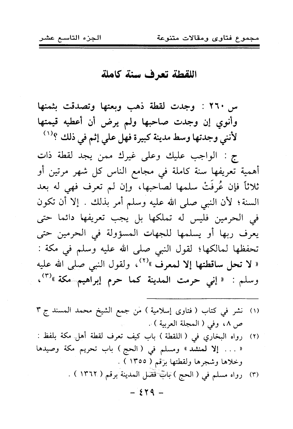 ج: الواجب عليك وعلى غيرك ممن يجد لقطة ذات أهمية تعريفها سنة كاملة في مجامع الناس كل شهر مرتين أو ثلاثا فإن عرفت سلمها لصاحبها، وإن لم تعرف فهي له بعد السنة؛ لأن النبي صلى الله عليه وسلم أمر بذلك. إلا أن تكون في الحرمين فليس له تملكها بل يجب تعريفها دائما حتى يعرف ربها أو يسلمها للجهات المسئولة في الحرمين حتى تحفظها لمالكها؛ لقول النبي صلى الله عليه وسلم في مكة: «لا تحل ساقطتها إلا لمعرف (¬2) » ، ولقول النبي صلى الله عليه وسلم: «إني حرمت المدينة كما حرم إبراهيم مكة (¬3) » ،
