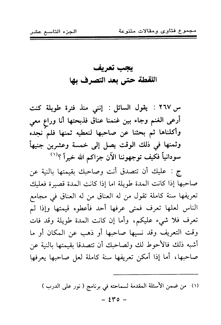 س 267: يقول السائل: إنني منذ فترة طويلة كنت أرعى الغنم وجاء بين غنمنا عناق فذبحتها أنا وراع معي وأكلناها ثم بحثنا عن صاحبها لنعطيه ثمنها فلم نجده وثمنها في ذلك الوقت يصل إلى خمسة وعشرين جنيها سودانيا فكيف توجهوننا الآن جزاكم الله خيرا؟ (¬1)