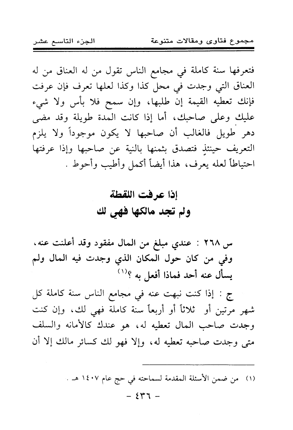 س 268: عندي مبلغ من المال مفقود وقد أعلنت عنه، وفي من كان حول المكان الذي وجدت فيه المال ولم يسأل عنه أحد فماذا أفعل به؟ (¬1) .