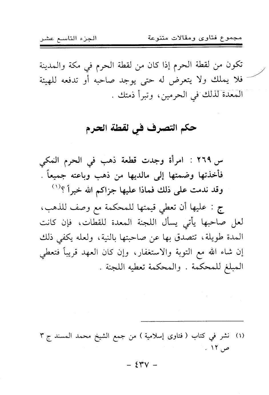 س 269: امرأة وجدت قطعة ذهب في الحرم المكي فأخذتها وضمتها إلى ما لديها من ذهب وباعته جميعا. وقد ندمت على ذلك فماذا عليها جزاكم الله خيرا؟ (¬1) .