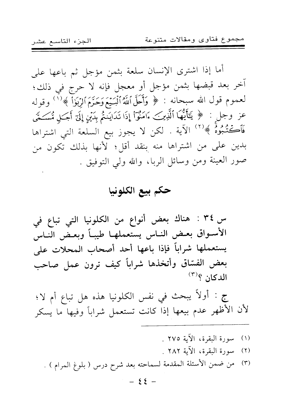 س 34: هناك بعض أنواع من الكلونيا التي تباع في الأسواق بعض الناس يستعملها طيبا وبعض الناس يستعملها شرابا فإذا باعها أحد أصحاب المحلات على بعض الفساق وأتخذها شرابا كيف ترون عمل صاحب الدكان؟ (¬1) .