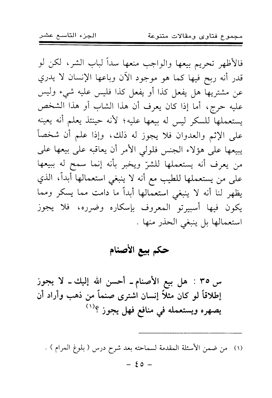 س 35: هل بيع الأصنام - أحسن الله إليك - لا يجوز إطلاقا لو كان مثلا إنسان اشترى صنما من ذهب وأراد أن يصهره ويستعمله في منافع فهل يجوز؟ (¬1) .