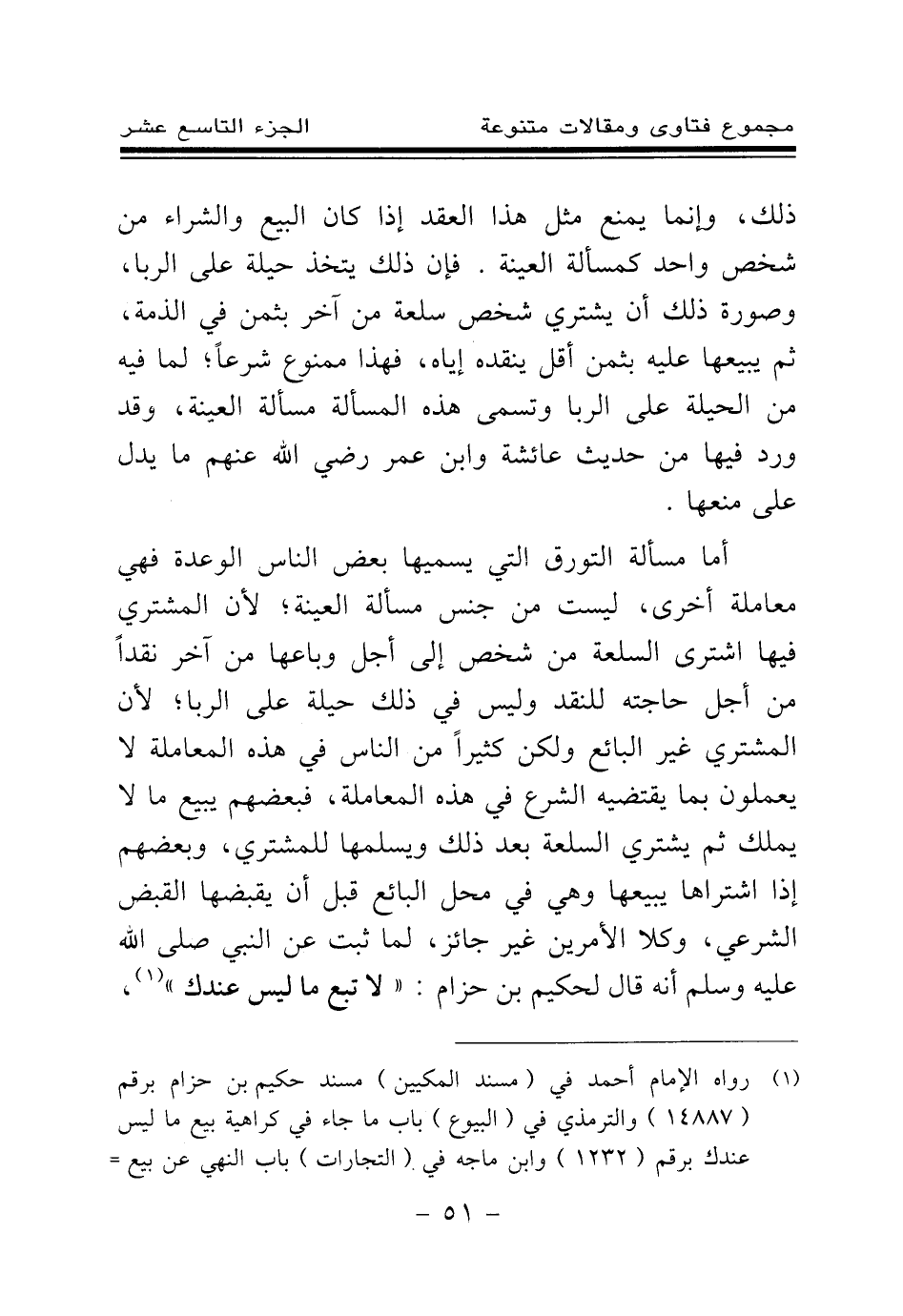 أما مسألة التورق التي يسميها بعض الناس الوعدة فهي معاملة أخرى، ليست من جنس مسألة العينة؛ لأن المشتري فيها اشترى السلعة من شخص إلى أجل وباعها من آخر نقدا من أجل حاجته للنقد وليس في ذلك حيلة على الربا؛ لأن المشتري غير البائع ولكن كثيرا من الناس في هذه المعاملة لا يعملون بما يقتضيه الشرع في هذه المعاملة، فبعضهم يبيع ما لا يملك ثم يشتري السلعة بعد ذلك ويسلمها للمشتري، وبعضهم إذا اشتراها يبيعها وهي في محل البائع قبل أن يقبضها القبض الشرعي، وكلا الأمرين غير جائز، لما ثبت عن النبي صلى الله عليه وسلم أنه قال لحكيم بن حزام: «لا تبع ما ليس عندك (¬1) » ،