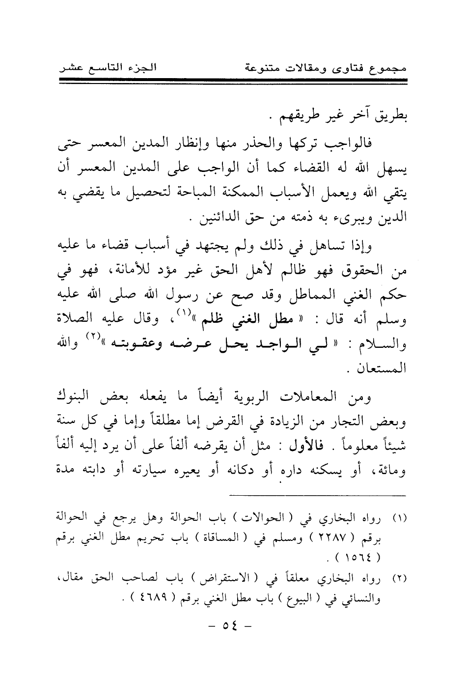 (¬1) رواه البخاري في (الحوالات) باب الحوالة وهل يرجع في الحوالة برقم (2287) ومسلم في (المساقاة) باب تحريم مطل الغني برقم (1564) .