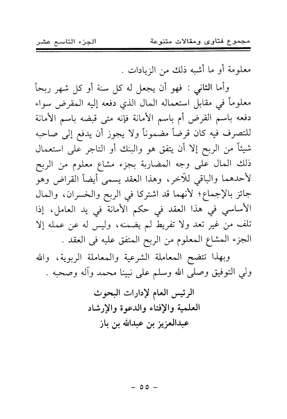 وأما الثاني: فهو أن يجعل له كل سنة أو كل شهر ربحا معلوما في مقابل استعماله المال الذي دفعه إليه المقرض سواء دفعه باسم القرض أم باسم الأمانة فإنه متى قبضه باسم الأمانة للتصرف فيه كان قرضا مضمونا ولا يجوز أن يدفع إلى صاحبه شيئا من الربح إلا أن يتفق هو والبنك أو التاجر على استعمال ذلك المال على وجه المضاربة بجزء مشاع معلوم من الربح لأحدهما والباقي للآخر، وهذا العقد يسمى أيضا القراض وهو جائز بالإجماع؛ لأنهما قد اشتركا في الربح والخسران، والمال الأساسي في هذا العقد في حكم الأمانة في يد العامل، إذا تلف من غير تعد ولا تفريط لم يضمنه، وليس له عن عمله إلا الجزء المشاع المعلوم من الربح المتفق عليه في العقد.