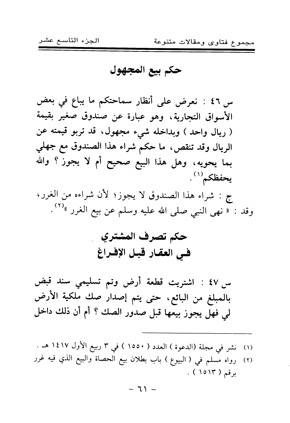 س 46: نعرض على أنظار سماحتكم ما يباع في بعض الأسواق التجارية، وهو عبارة عن صندوق صغير بقيمة (ريال واحد) وبداخله شيء مجهول، قد تربو قيمته عن الريال وقد تنقص، ما حكم شراء هذا الصندوق مع جهلي بما يحويه، وهل هذا البيع صحيح أم لا يجوز؟ والله يحفظكم (¬1) .