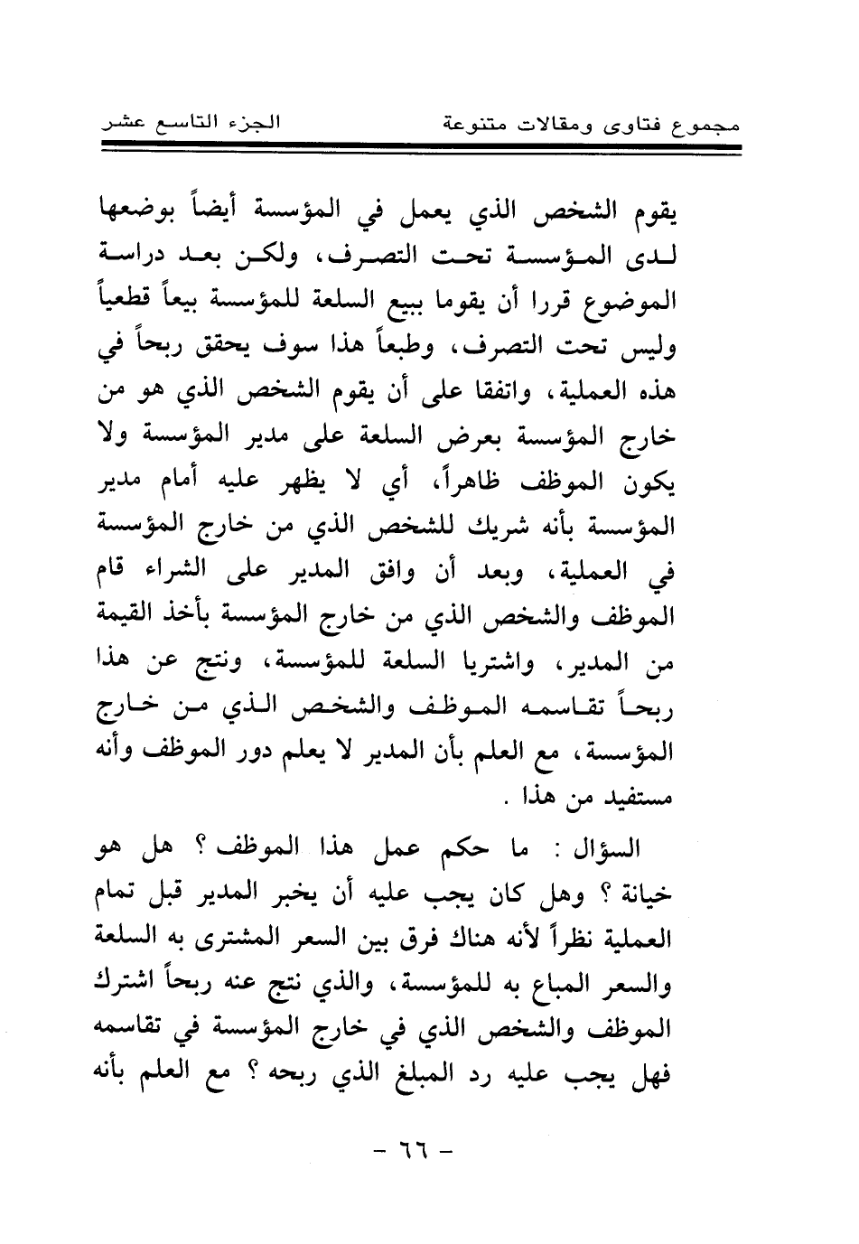 وهل كان يجب عليه أن يخبر المدير قبل تمام العملية نظرا لأنه هناك فرق بين السعر المشترى به السلعة والسعر المباع به للمؤسسة، والذي نتج عنه ربحا اشترك الموظف والشخص الذي في خارج المؤسسة في تقاسمه فهل يجب عليه رد المبلغ الذي ربحه؟