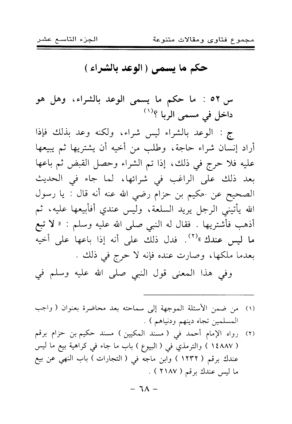 س 52: ما حكم ما يسمى الوعد بالشراء، وهل هو داخل في مسمى الربا؟ (¬1)
