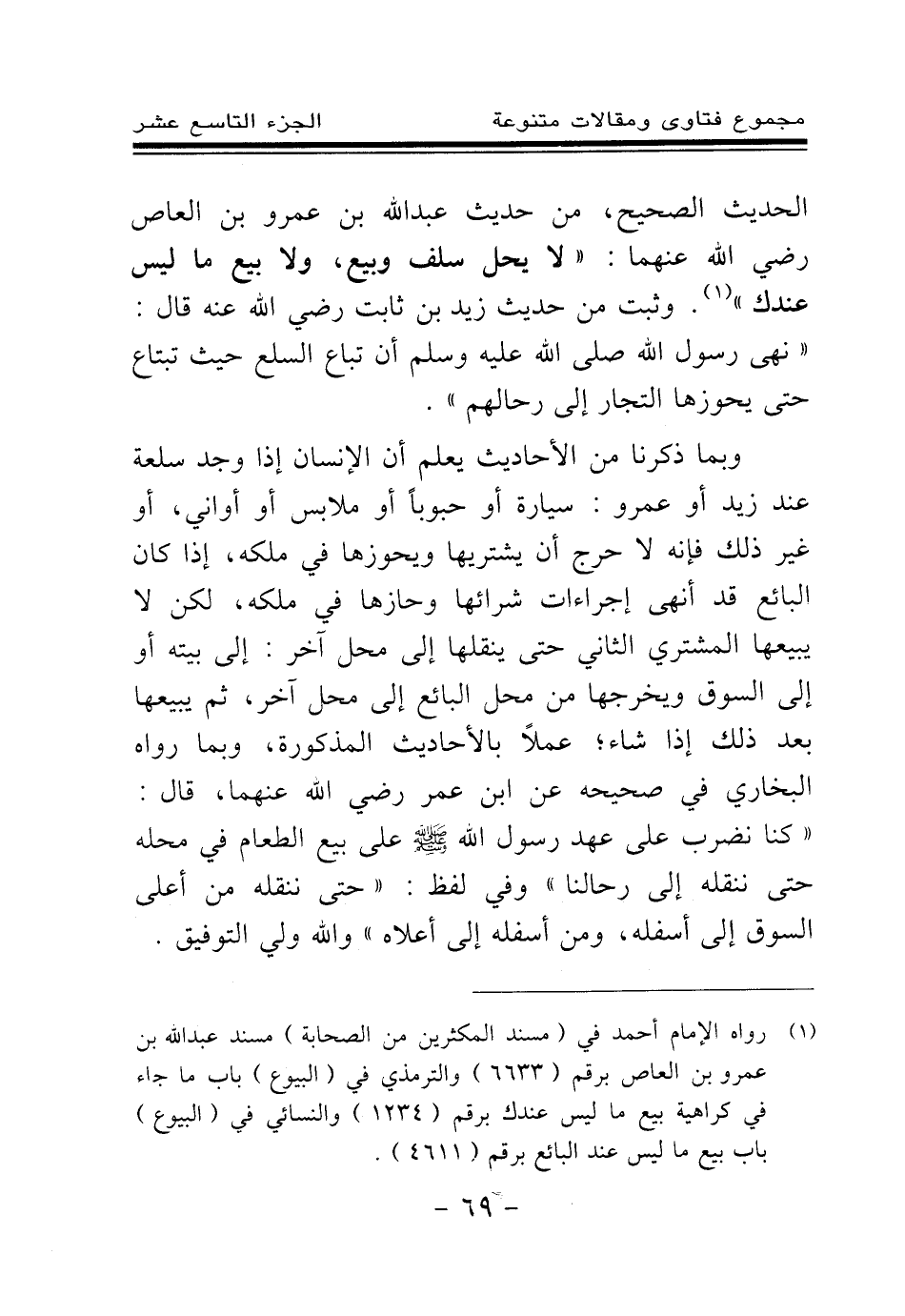 الحديث الصحيح، من حديث عبد الله بن عمرو بن العاص رضي الله عنهما: «لا يحل سلف ولا بيع، ولا بيع ما ليس عندك (¬1) » ، وثبت من حديث زيد بن ثابت رضي الله عنه قال: «نهى رسول الله صلى الله عليه وسلم أن تباع السلع حيث تبتاع حتى يحوزها التجار إلى رحالهم (¬2) » .