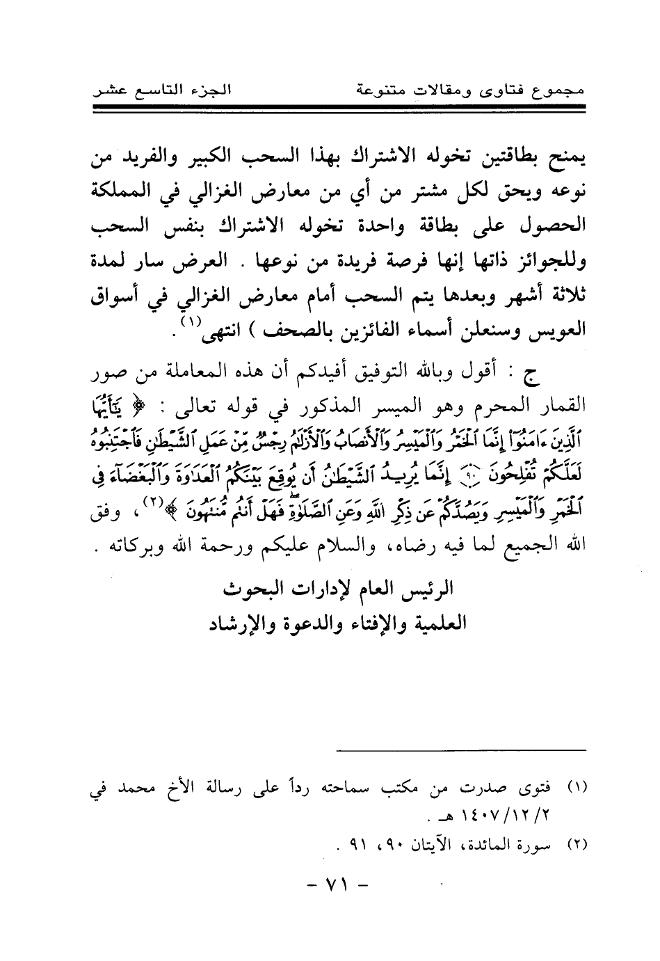 ج: أقول وبالله التوفيق أفيدكم أن هذه المعاملة من صور القمار المحرم وهو الميسر المذكور في قوله تعالى: {يَا أَيُّهَا الَّذِينَ آمَنُوا إِنَّمَا الْخَمْرُ وَالْمَيْسِرُ وَالْأَنْصَابُ وَالْأَزْلَامُ رِجْسٌ مِنْ عَمَلِ الشَّيْطَانِ فَاجْتَنِبُوهُ لَعَلَّكُمْ تُفْلِحُونَ} (¬2) {إِنَّمَا يُرِيدُ الشَّيْطَانُ أَنْ يُوقِعَ بَيْنَكُمُ الْعَدَاوَةَ وَالْبَغْضَاءَ فِي الْخَمْرِ وَالْمَيْسِرِ وَيَصُدَّكُمْ عَنْ ذِكْرِ اللَّهِ وَعَنِ الصَّلَاةِ فَهَلْ أَنْتُمْ مُنْتَهُونَ} (¬3) وفق الله الجميع لما فيه رضاه، والسلام عليكم ورحمة الله وبركاته.