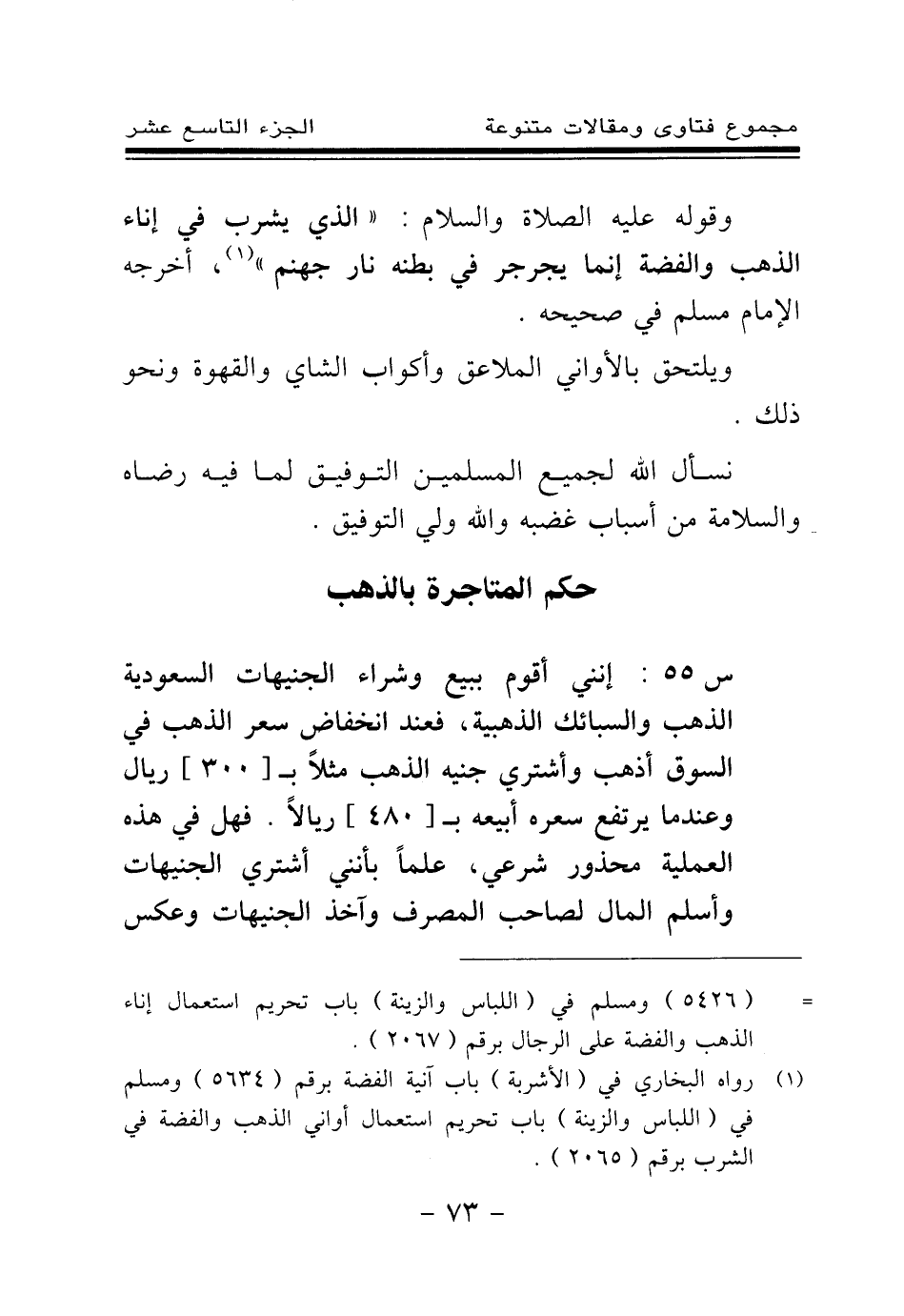 س 55: إنني أقوم ببيع وشراء الجنيهات السعودية الذهب والسبائك الذهبية، فعند انخفاض سعر الذهب في السوق أذهب وأشتري جنيه الذهب مثلا بـ (300) ريال وعندما يرتفع سعره أبيعه بـ (480) ريالا. فهل في هذه العملية محذور شرعي، علما بأنني أشتري الجنيهات وأسلم المال لصاحب المصرف وآخذ الجنيهات وعكس