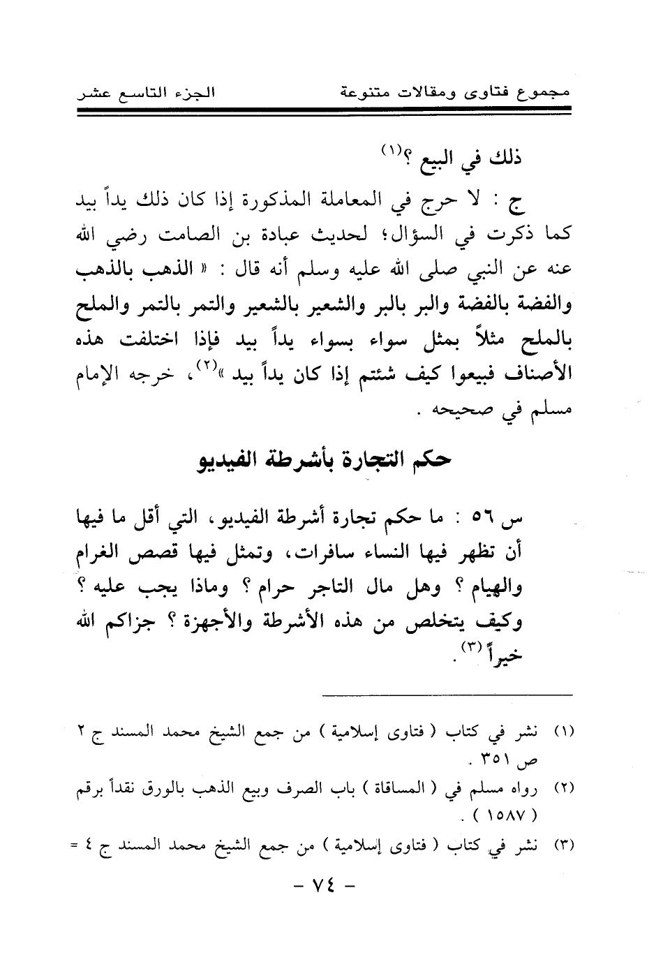 ج: لا حرج في المعاملة المذكورة إذا كان ذلك يدا بيد كما ذكرت في السؤال؛ لحديث عبادة بن الصامت رضي الله عنه عن النبي صلى الله عليه وسلم أنه قال: «الذهب بالذهب والفضة بالفضة والبر بالبر والشعير بالشعير والتمر بالتمر والملح بالملح مثلا بمثل سواء بسواء يدا بيد فإذا اختلفت هذه الأصناف فبيعوا كيف شئتم إذا كان يدا بيد (¬2) » ، خرجه الإمام مسلم في صحيحه.