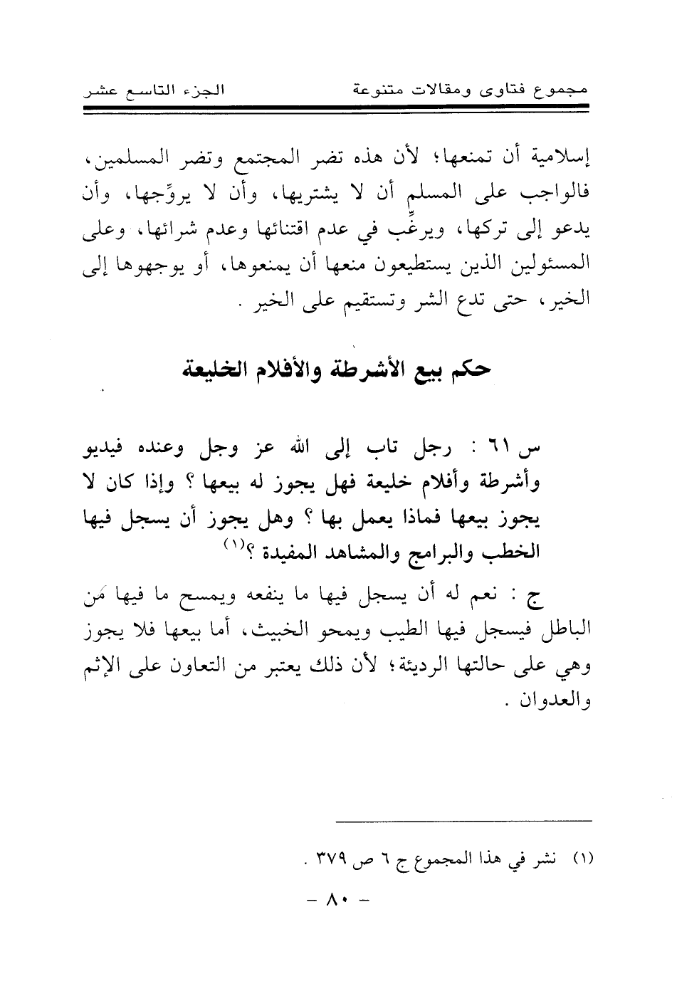 س 61: رجل تاب إلى الله عز وجل وعنده فيديو وأشرطة وأفلام خليعة فهل يجوز له بيعها؟ وإذا كان لا يجوز بيعها فماذا يعمل بها؟ وهل يجوز أن يسجل فيها الخطب والبرامج والمشاهدة المفيدة؟ (¬1)