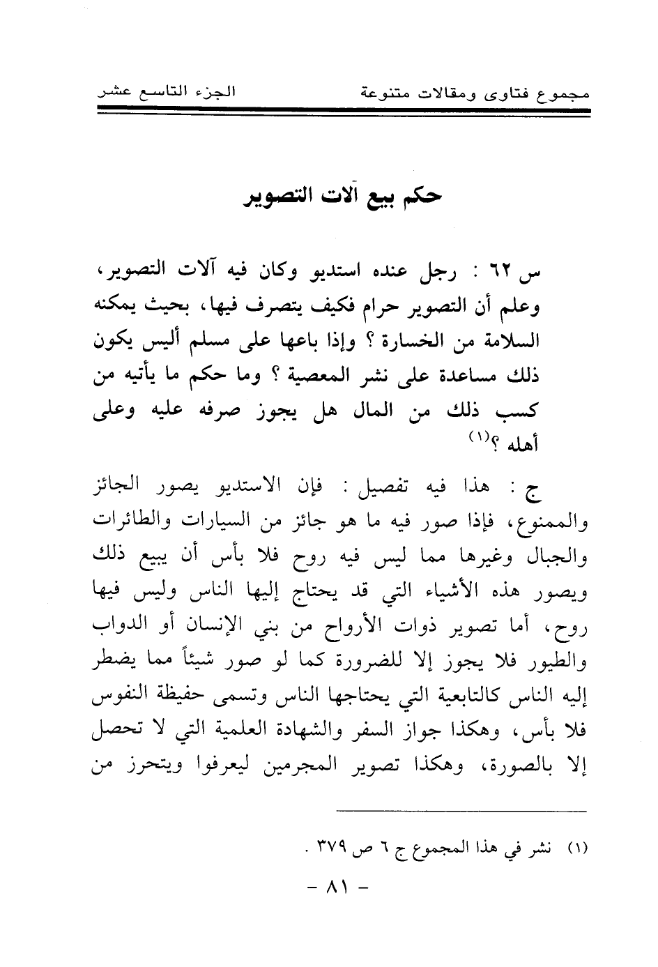 س 62: رجل عنده استديو وكان فيه آلات التصوير، وعلم أن التصوير حرام فكيف يتصرف فيها، بحيث يمكنه السلامة من الخسارة؟ وإذا باعها على مسلم أليس يكون ذلك مساعدة على نشر المعصية؟ وما حكم ما يأتيه من كسب ذلك من المال هل يجوز صرفه عليه وعلى أهله؟ (¬1) .