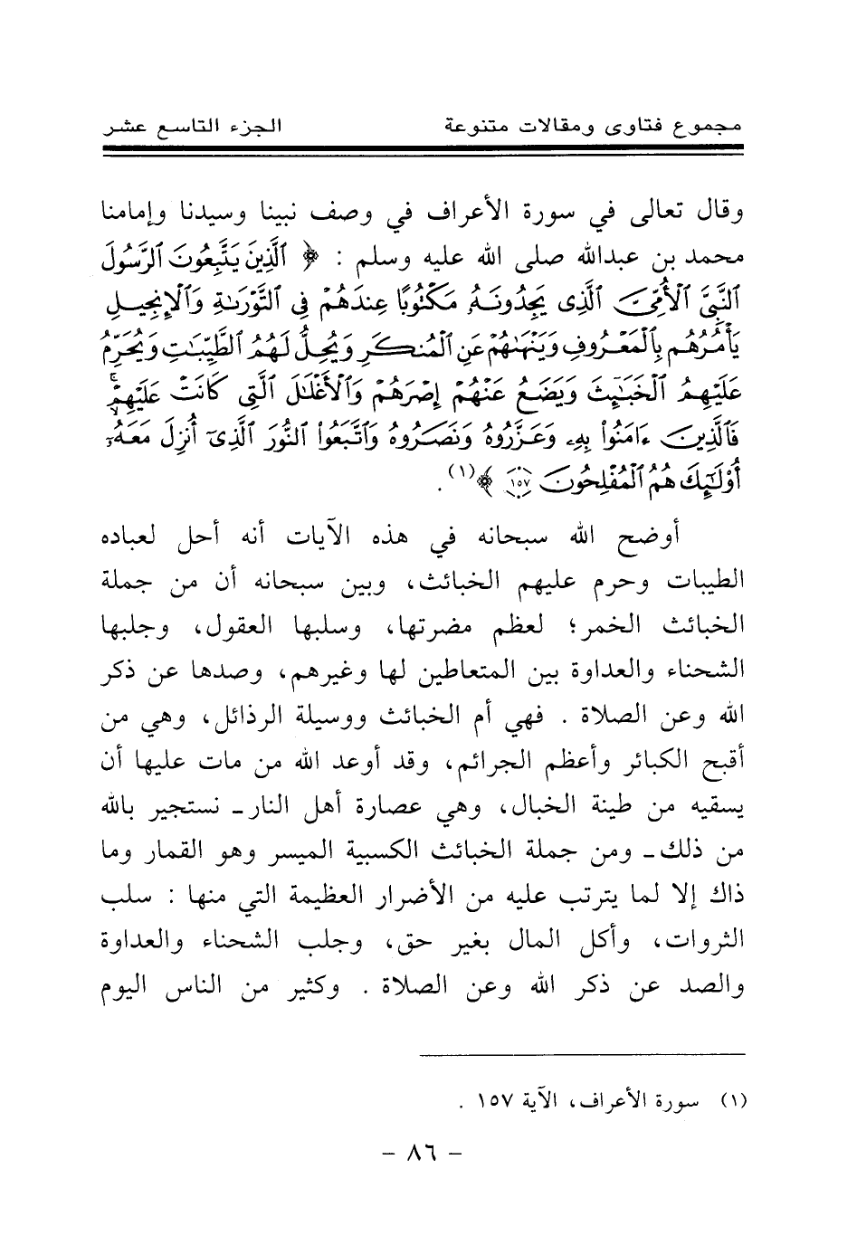 أوضح الله سبحانه في هذه الآيات أنه أحل لعباده الطيبات وحرم عليهم الخبائث، وبين سبحانه أن من جملة الخبائث الخمر؛ لعظم مضرتها، وسلبها العقول، وجلبها الشحناء والعداوة بين المتعاطين لها وغيرهم، وصدها عن ذكر الله وعن الصلاة. فهي أم الخبائث ووسيلة الرذائل، وهي من أقبح الكبائر وأعظم الجرائم، وقد أوعد الله من مات عليها أن يسقيه من طينة الخبال، وهي عصارة أهل النار- نستجير بالله من ذلك - ومن جملة الخبائث الكسبية الميسر وهو القمار وما ذاك إلا لما يترتب عليه من الأضرار العظيمة التي منها: سلب الثروات، وأكل المال بغير حق، وجلب الشحناء والعداوة والصد عن ذكر الله وعن الصلاة. وكثير من الناس اليوم