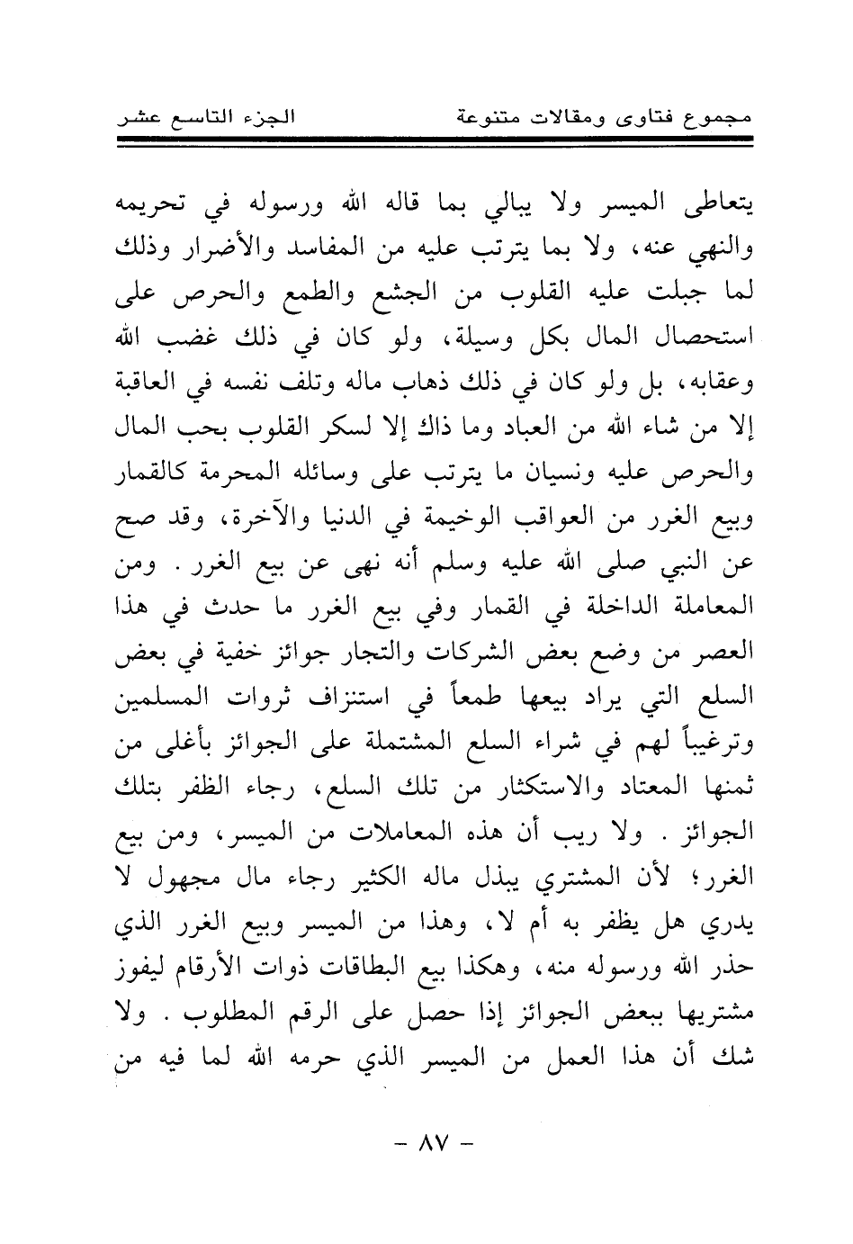 يتعاطى الميسر ولا يبالي بما قاله الله ورسوله في تحريمه والنهي عنه، ولا بما يترتب عليه من المفاسد والأضرار وذلك لما جبلت عليه القلوب من الجشع والطمع والحرص على استحصال المال بكل وسيلة، ولو كان في ذلك غضب الله وعقابه، بل ولو كان في ذلك ذهاب ماله وتلف نفسه في العاقبة إلا من شاء الله من العباد وما ذاك إلا لسكر القلوب بحب المال والحرص عليه ونسيان ما يترتب على وسائله المحرمة كالقمار وبيع الغرر من العواقب الوخيمة في الدنيا والآخرة، وقد صح عن النبي صلى الله عليه وسلم أنه نهى عن بيع الغرر. ومن المعاملة الداخلة في القمار وفي بيع الغرر ما حدث في هذا العصر من وضع بعض الشركات والتجار جوائز خفية في بعض السلع التي يراد بيعها طمعا في استنزاف ثروات المسلمين وترغيبا لهم في شراء السلع المشتملة على الجوائز بأغلى من ثمنها المعتاد والاستكثار من تلك السلع، رجاء الظفر بتلك الجوائز. ولا ريب أن هذه المعاملات من الميسر، ومن بيع الغرر؛ لأن المشتري يبذل ماله الكثير رجاء مال مجهول لا يدري هل يظفر به أم لا، وهذا من الميسر وبيع الغرر الذي حذر الله ورسوله منه، وهكذا بيع البطاقات ذوات الأرقام ليفوز مشتريها ببعض الجوائز إذا حصل على الرقم المطلوب. ولا شك أن هذا العمل من الميسر الذي حرمه الله لما فيه من