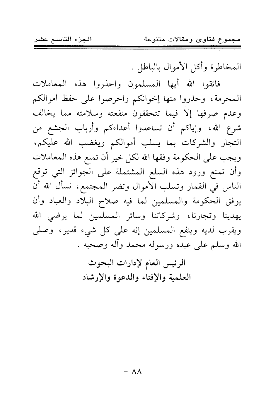 فاتقوا الله أيها المسلمون واحذروا هذه المعاملات المحرمة، وحذروا منها إخوانكم واحرصوا على حفظ أموالكم وعدم صرفها إلا فيما تتحققون منفعته وسلامته مما يخالف شرع الله، وإياكم أن تساعدوا أعداءكم وأرباب الجشع من التجار والشركات بما يسلب أموالكم ويغضب الله عليكم، ويجب على الحكومة وفقها الله لكل خير أن تمنع هذه المعاملات وأن تمنع ورود هذه السلع المشتملة على الجوائز التي توقع الناس في القمار وتسلب الأموال وتضر المجتمع، نسأل الله أن يوفق الحكومة والمسلمين لما فيه صلاح البلاد والعباد وأن يهدينا وتجارنا، وشركاتنا وسائر المسلمين لما يرضي الله ويقرب لديه وينفع المسلمين إنه على كل شيء قدير، وصلى الله وسلم على عبده ورسوله محمد وآله وصحبه.