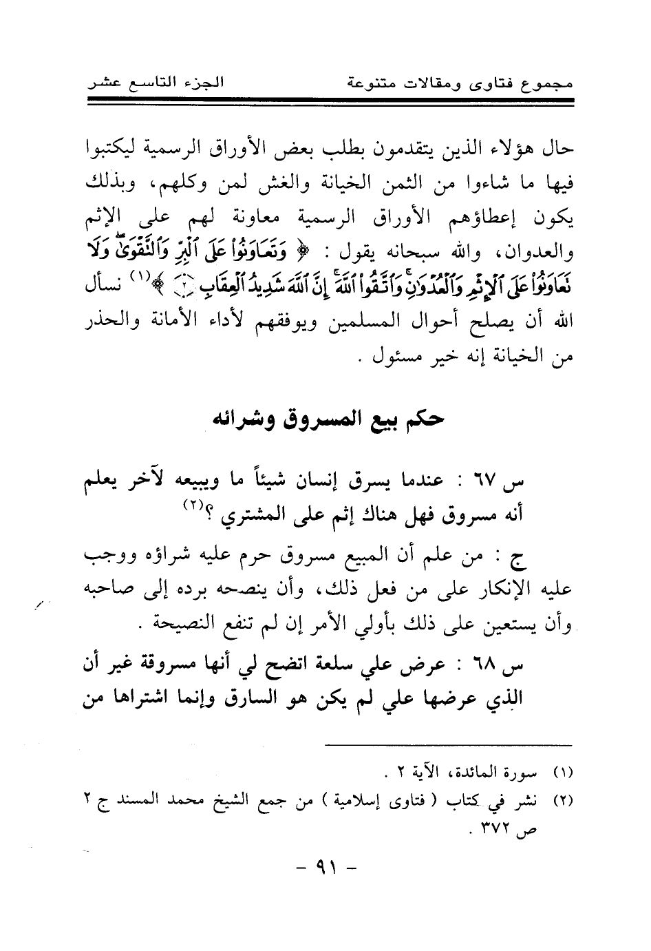 س 67: عندما يسرق إنسان شيئا ما ويبيعه لآخر يعلم أنه مسروق فهل هناك إثم على المشتري؟ (¬1)
