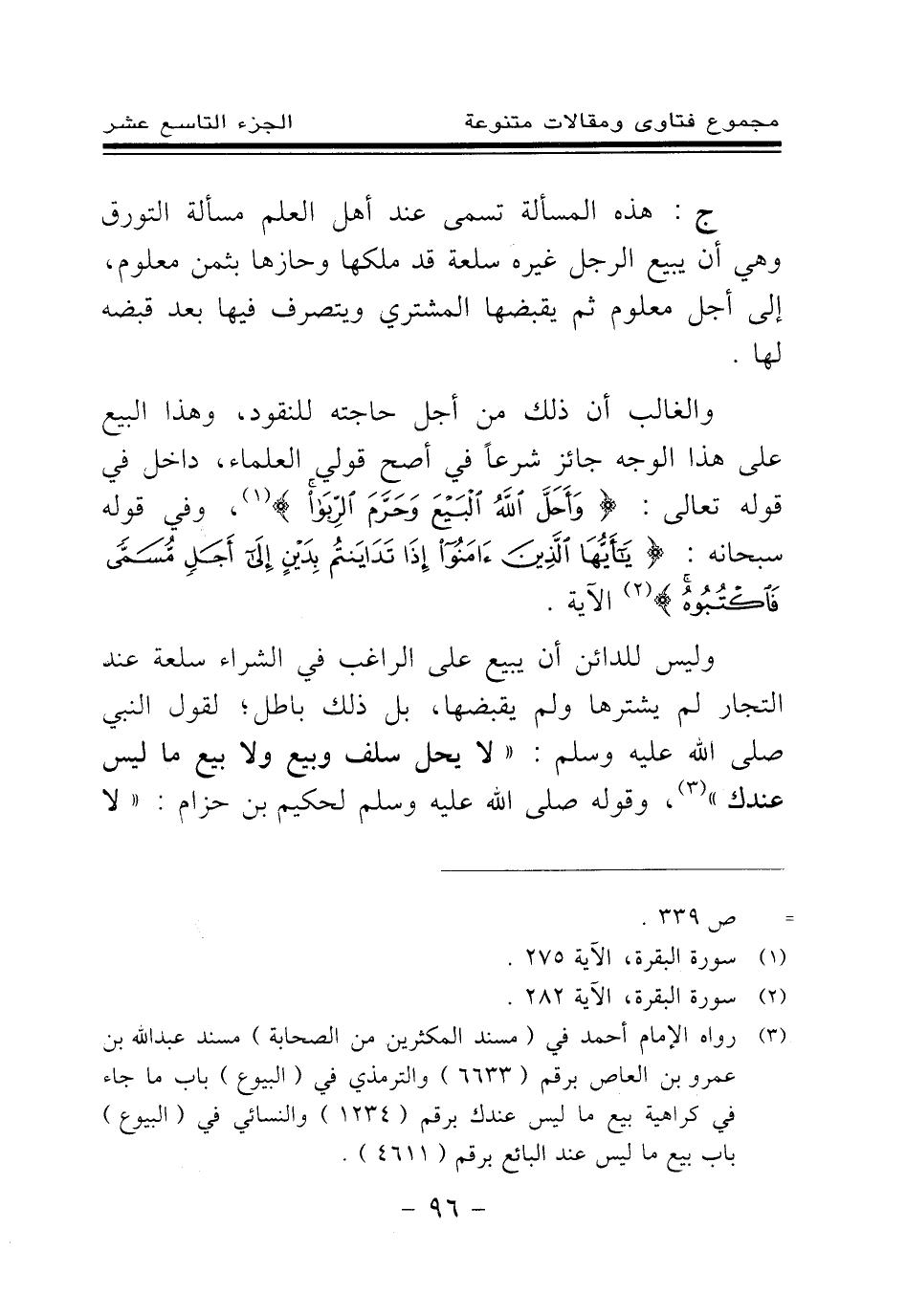 والغالب أن ذلك من أجل حاجته للنقود، وهذا البيع على هذا الوجه جائز شرعا في أصح قولي العلماء، داخل في قوله تعالى: {وَأَحَلَّ اللَّهُ الْبَيْعَ وَحَرَّمَ الرِّبَا} (¬1) وفي قوله سبحانه: {يَا أَيُّهَا الَّذِينَ آمَنُوا إِذَا تَدَايَنْتُمْ بِدَيْنٍ إِلَى أَجَلٍ مُسَمًّى فَاكْتُبُوهُ} (¬2) الآية.