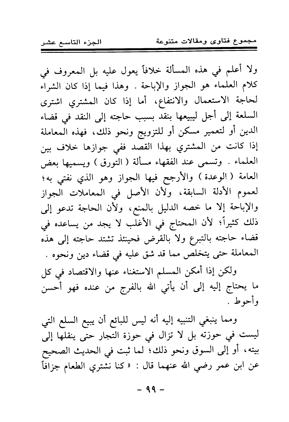 ولا أعلم في هذه المسألة خلافا يعول عليه بل المعروف في كلام العلماء هو الجواز والإباحة. وهذا فيما إذا كان الشراء لحاجة الاستعمال والانتفاع، أما إذا كان المشتري اشترى السلعة إلى أجل ليبيعها بنقد بسبب حاجته إلى النقد في قضاء الدين أو لتعمير مسكن أو للتزويج ونحو ذلك، فهذه المعاملة إذا كانت من المشتري بهذا القصد ففي جوازها خلاف بين العلماء، وتسمى عند الفقهاء مسألة (التورق) ويسميها بعض العامة (الوعدة) والأرجح فيها الجواز وهو الذي نفتي به؛ لعموم الأدلة السابقة، ولأن الأصل في المعاملات الجواز والإباحة إلا ما خصه الدليل بالمنع، ولأن الحاجة تدعو إلى ذلك كثيرا؛ لأن المحتاج في الأغلب لا يجد من يساعده في قضاء حاجته بالتبرع ولا بالقرض فحينئذ تشتد حاجته إلى هذه المعاملة حتى يتخلص مما قد شق عليه في قضاء دين ونحوه.