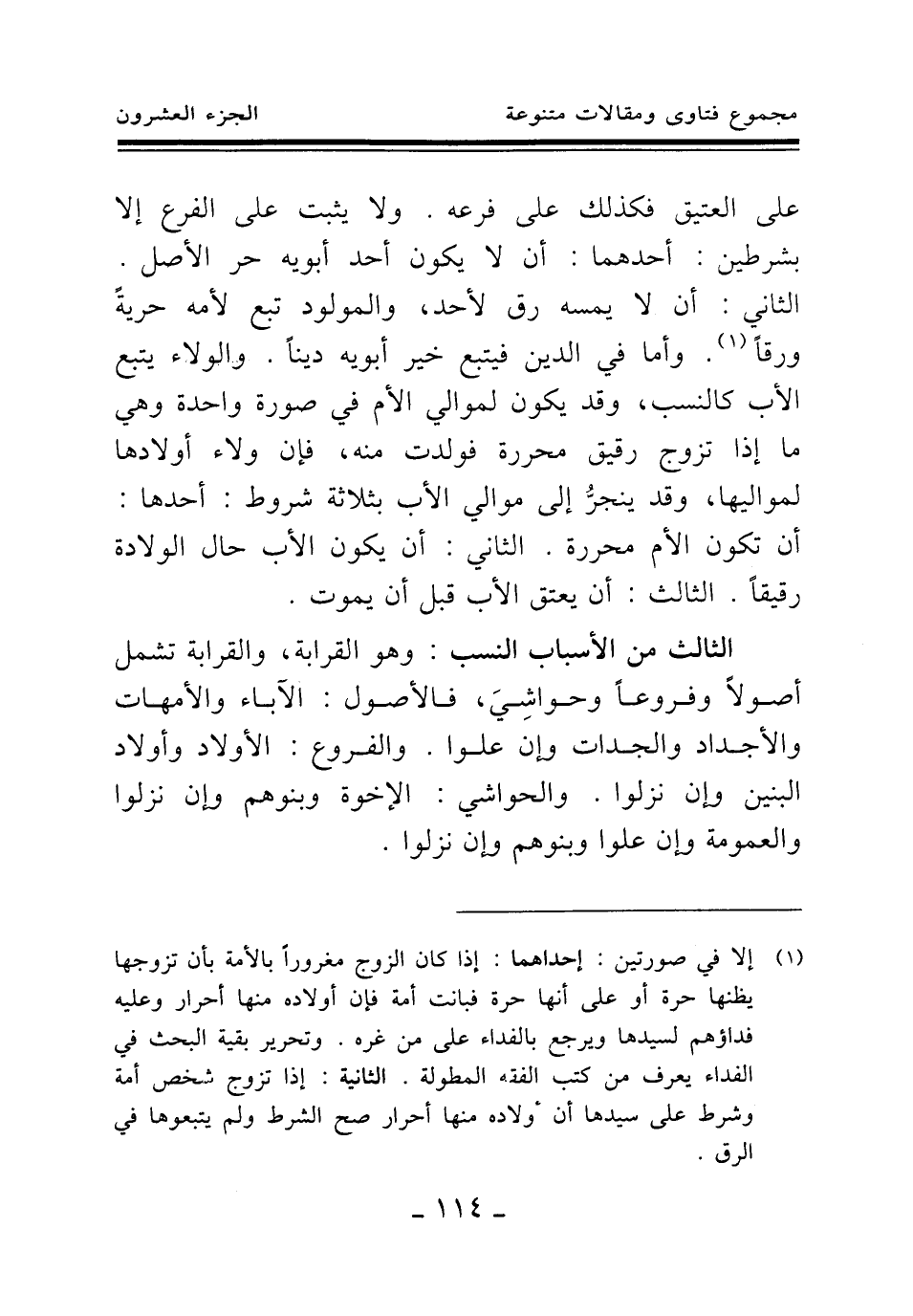 الثاني: أن لا يمسه رق لأحد، والمولود تبع لأمه حرية ورقا. وأما في الدين فيتبع خير أبويه دينا. والولاء يتبع الأب كالنسب، وقد يكون لموالي الأم في صورة واحدة وهي ما إذا تزوج رقيق محررة فولدت منه، فإن ولاء أولادها لمواليها، وقد ينجر إلى موالي الأب بثلاثة شروط: أحدها: أن تكون الأم محررة. الثاني: أن يكون الأب حال الولادة رقيقا. الثالث: أن يعتق الأب قبل أن يموت.