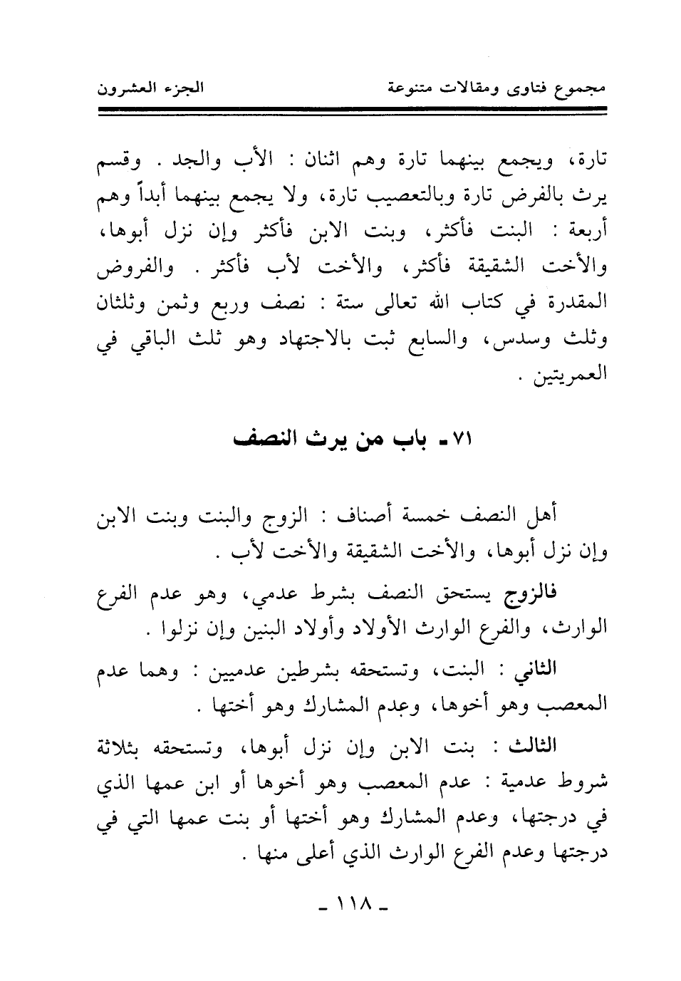 تارة، ويجمع بينهما تارة وهم اثنان: الأب والجد. وقسم يرث بالفرض تارة وبالتعصيب تارة، ولا يجمع بينهما أبدا، وهم أربعة: البنت فأكثر، وبنت الابن فأكثر وإن نزل أبوها، والأخت الشقيقة فأكثر، والأخت لأب فأكثر. والفروض المقدرة في كتاب الله تعالى ستة: نصف وربع وثمن وثلثان وثلث وسدس، والسابع ثبت بالاجتهاد وهو ثلث الباقي في العمريتين.