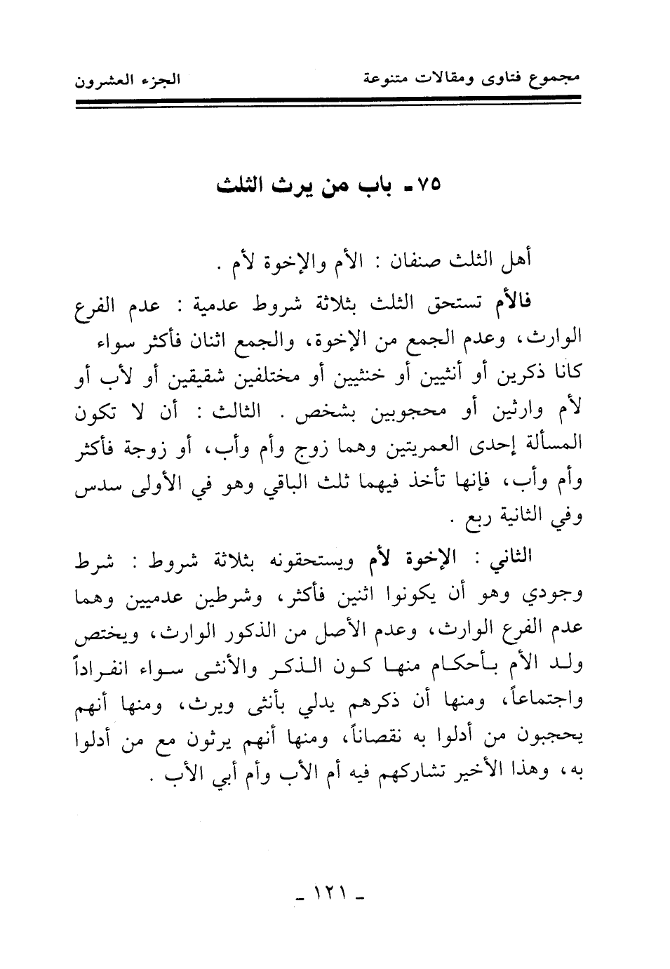 فالأم تستحق الثلث بثلاثة شروط عدمية: عدم الفرع الوارث، وعدم الجمع من الإخوة، والجمع اثنان فأكثر سواء كانا ذكرين أو أنثيين أو خنثيين أو مختلفين شقيقين أو لأب أو لأم وارثين أو محجوبين بشخص. الثالث: أن لا تكون المسألة إحدى العمريتين وهما زوج وأم وأب، أو زوجة فأكثر وأم وأب، فإنها تأخذ فيهما ثلث الباقي وهو في الأولى سدس وفي الثانية ربع.