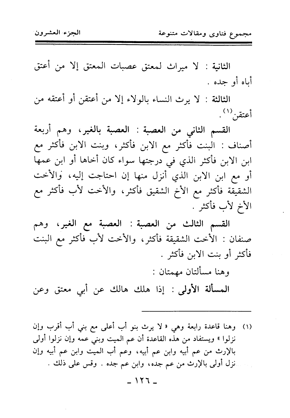 الثانية: لا ميراث لمعتق عصبات المعتق إلا من أعتق أباه أو جده.