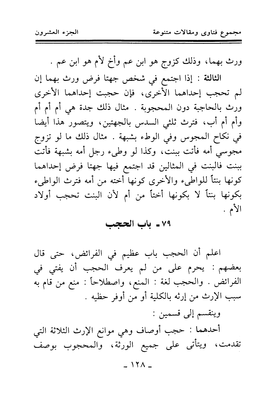 اعلم أن الحجب باب عظيم في الفرائض، حتى قال بعضهم: يحرم على من لم يعرف الحجب أن يفتي في الفرائض. والحجب لغة: المنع، واصطلاحا: منع من قام به سبب الإرث من إرثه بالكلية أو من أوفر حظيه.
