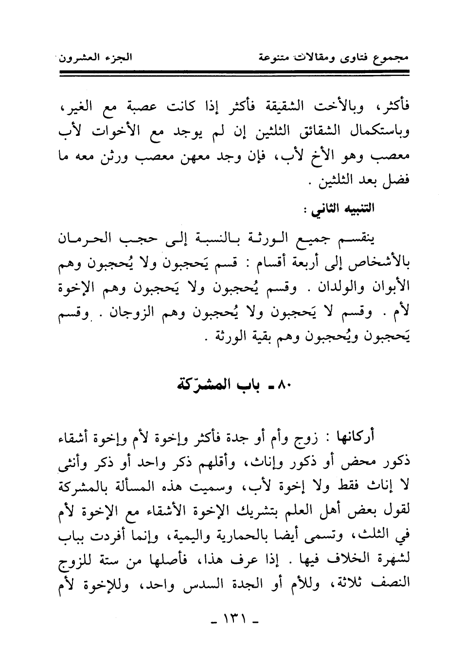 أركانها: زوج وأم أو جدة فأكثر وإخوة لأم وإخوة أشقاء ذكور محض أو ذكور وإناث، وأقلهم ذكر واحد أو ذكر وأنثى لا إناث فقط ولا إخوة لأب، وسميت هذه المسألة بالمشركة؛ لقول بعض أهل العلم بتشريك الإخوة الأشقاء مع الإخوة لأم في الثلث، وتسمى أيضا بالحمارية واليمية، وإنما أفردت بباب لشهرة الخلاف فيها. إذا عرف هذا، فأصلها من ستة للزوج النصف ثلاثة، وللأم أو الجدة السدس واحد، وللإخوة لأم